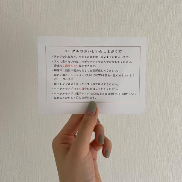 小金井ベーグル研究所では、購入した際に保存方法やトースト時間が書かれた説明書がもらえるので、おうちでも安心して美味しいベーグルを食べることができますよ。