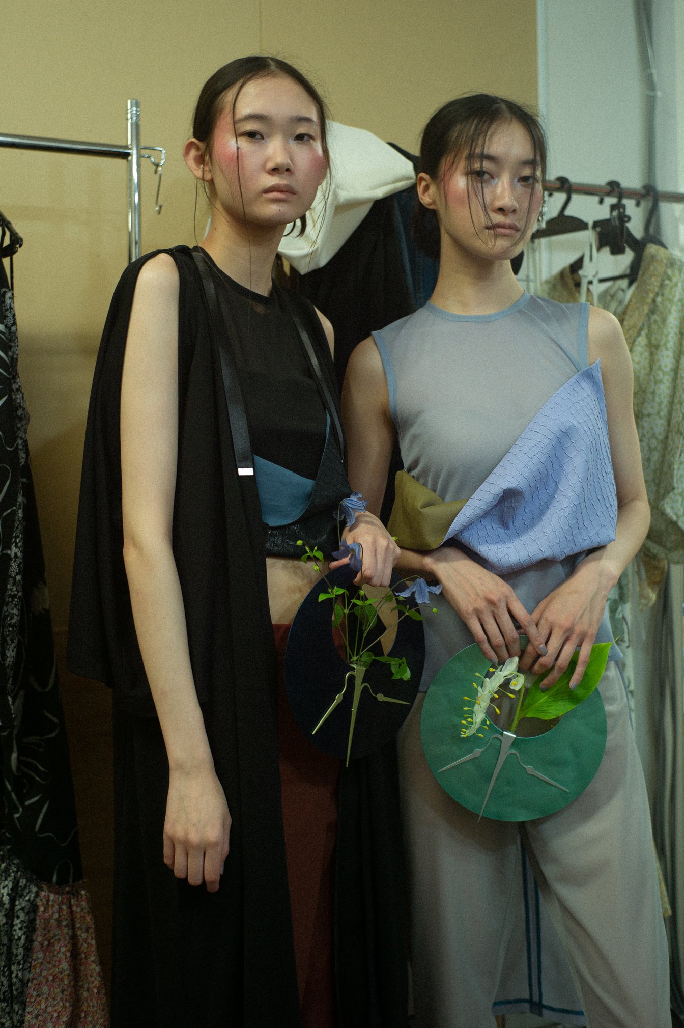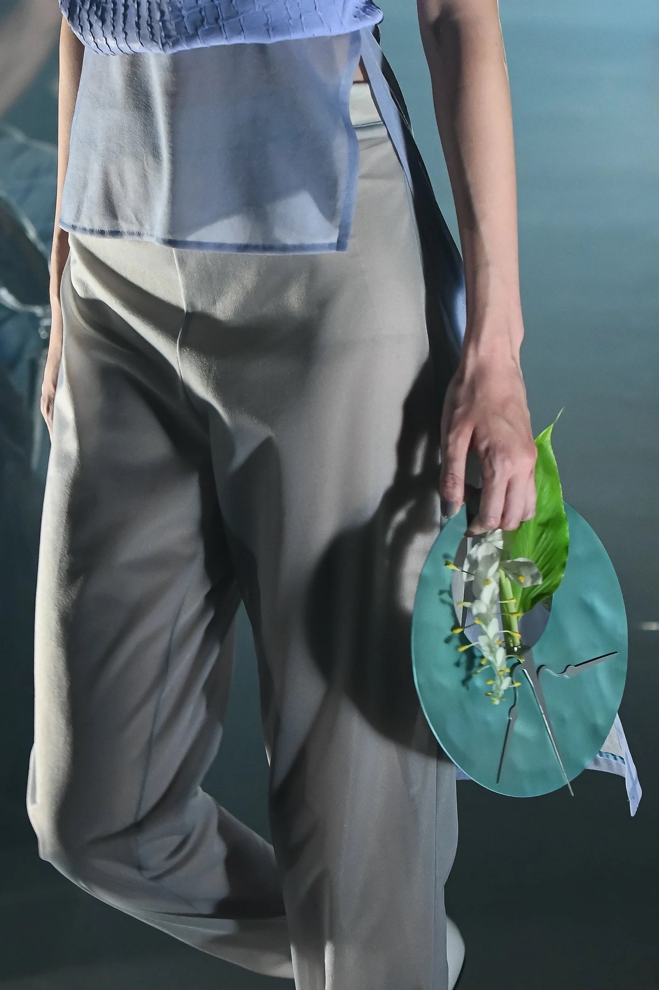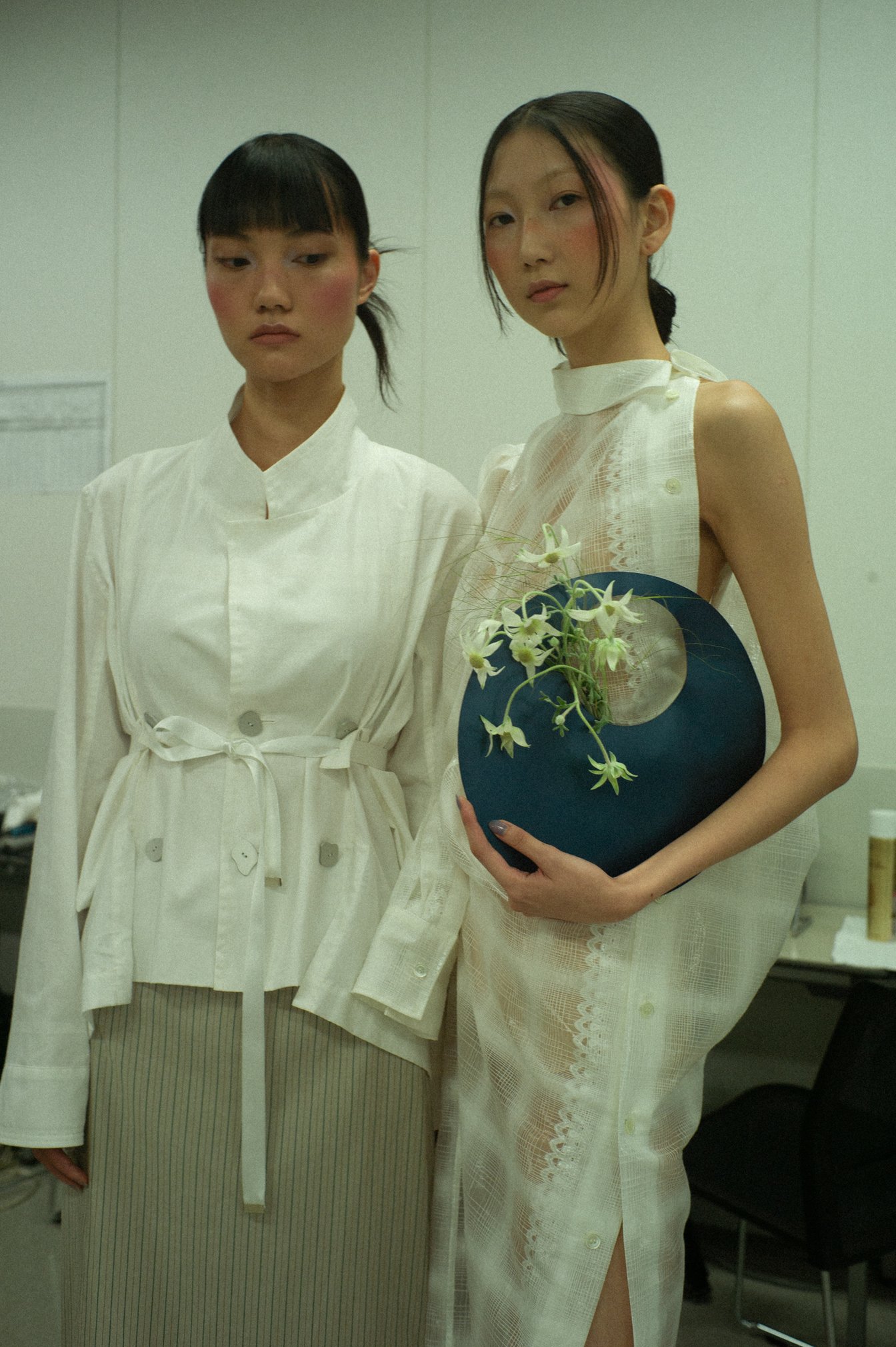 軽い素材をあまり使用したことがなく春夏シーズンが苦手だったという譚だが、2024年春夏コレクションでは軽い布帛を造形的に構築。透け感のあるチェックのワンピースなどクリーンな印象のなかに歪みをやねじれを加えたルックを多く揃えた。一輪挿しが付けられたアルミの板のバッグは、アルミ工場の既製品の円盤に、花を挿すことができるオリジナルのメタルパーツを装着。持ち歩くだけでなく、インテリアとして飾っても美しいデザインに仕上げた。夢心地のような雰囲気のショーの中で、花を持って歩くためだけに作られたバッグは、異国の地で孤独を感じる人間に寄り添ってくれる救いのようにも、ふと散歩中に見つけて摘んだ花のような軽快なアイテムのようにも見える。