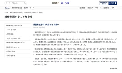 繊研新聞は、2020年3月、原材料費や輸送コストの上昇などを理由に本紙の購読料を500円引き上げ、4089円から4629円に改定。現在も、新聞用紙などの原材料や印刷、輸送費といったコストの高騰が続いていることから、さらなる購読料の引き上げに至ったという。