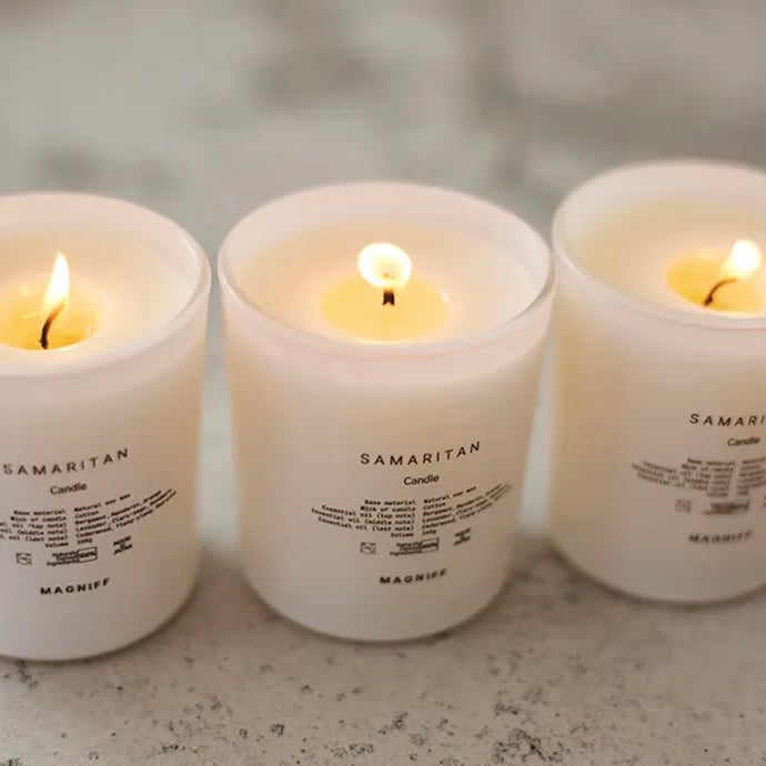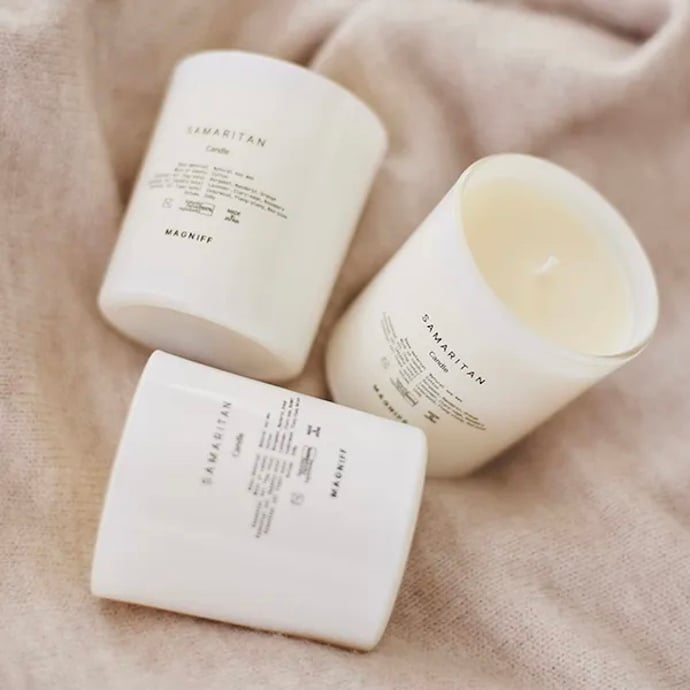 「マグニフ」初のフレグランスアイテムとなる、100%植物由来のアロマキャンドル「MAGNIFF キャンドル サマリタン」(税込5940円/160g)も要チェック。