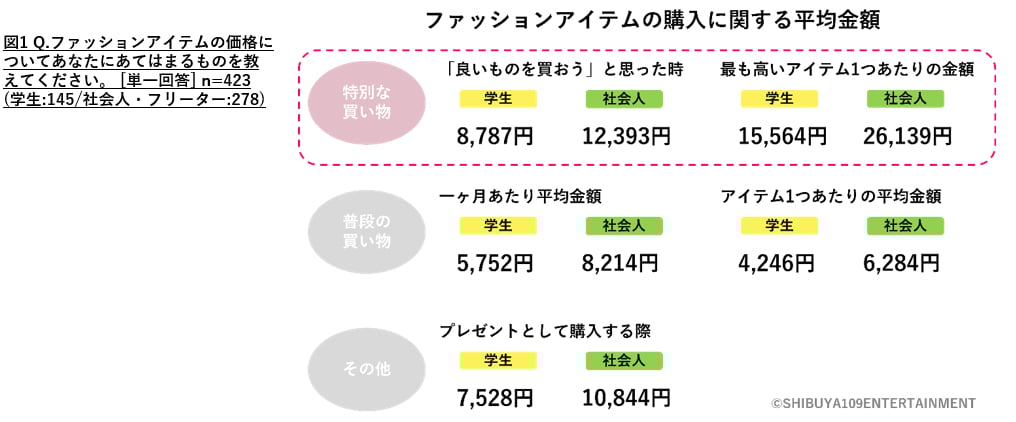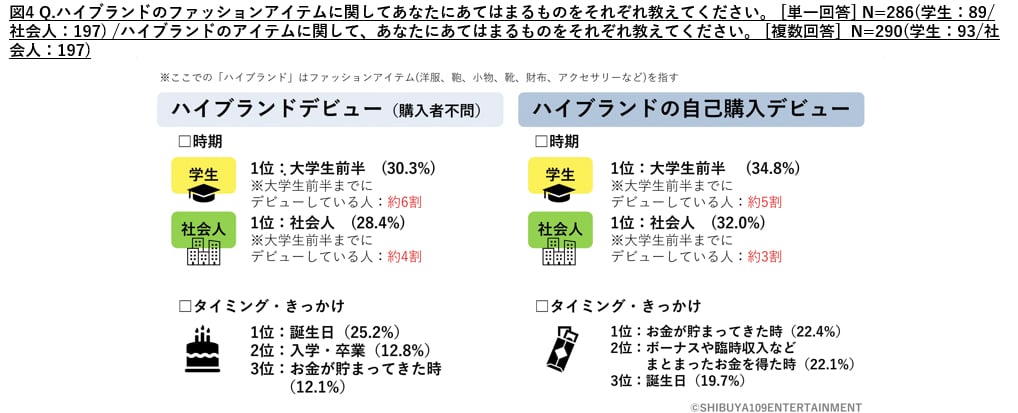 調査内容は、Z世代が「『良いものを買おう』と思った時に購入するファッションアイテムの平均金額」、「ハイブランドのファッションアイテムを初めて着用?利用し始めた時期」、「ハイブランドのイメージや関心」、「ハイブランドを持つ自分の周りからの見え方」の主に5つ。ファッションアイテムの平均価格は、大学生が8787円、社会人が1万2393円で、Z世代全体としては平均約1万円という結果となった。ハイブランドの初着用?利用時期や、初めての購入は、現役大学生は1、2年生で大半がデビューし、現役社会人は社会人時代に初着用?利用しており、Z世代では現役大学生の方が早い段階でハイブランドに触れる傾向があると分かった。