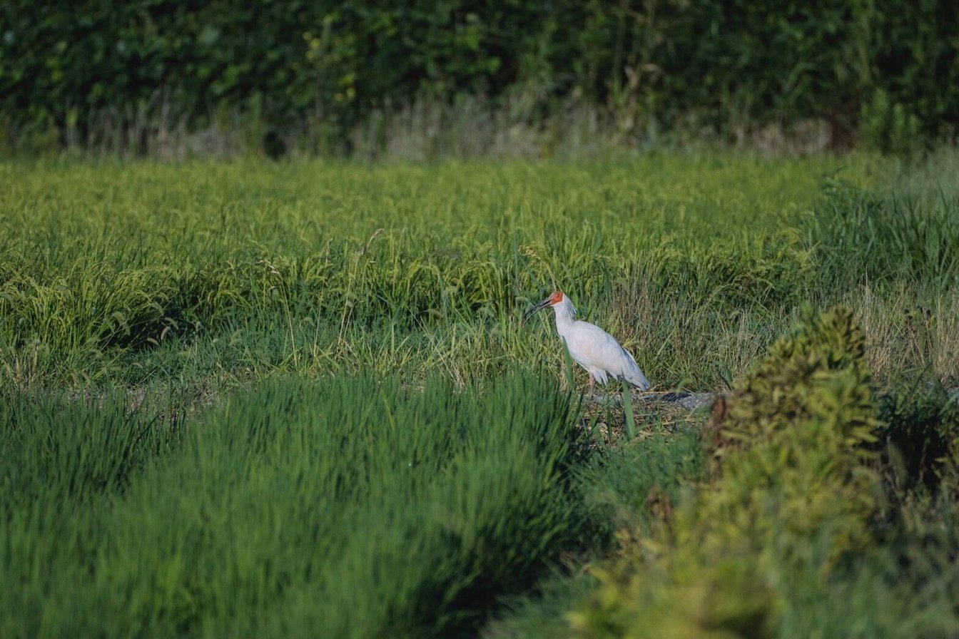 一度絶滅の危機に瀕した朱鷺。今では少しずつ復活して佐渡島の田んぼでも見かけるようになってきた。