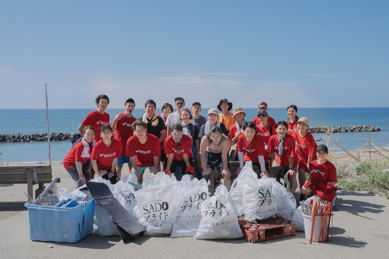 佐渡島?素浜海岸にてREDLIST IMPACTS(ビーチクリーン活動)を行う様子。