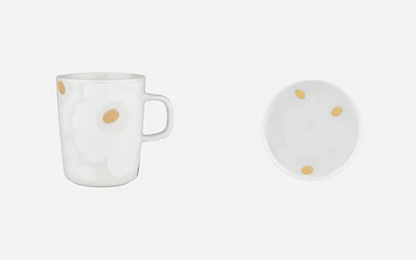 「マリメッコ」といえばの『ウニッコ柄』が施された「マグカップ」(3960円)と「プレート」(3960円)は、うっすらとプリントが見えるさりげなさがポイント。花の中心に配されているゴールドも素敵です。