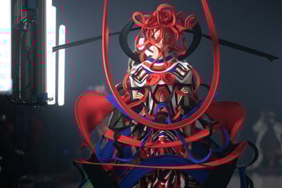 同展では、縄文時代の人々の暮らしに着想を得た「JOMONJOMON」シリーズの新作を発表。縄文時代の人々が、自然に対する畏怖を感じながらも共生し、恩恵を受け、祈りを込めながら作っていた「縄文土器」を想起させる、うねうねとした曲線や装飾を、広島の厳島神社の大鳥居の秩序と意志を意識したシンメトリーな造形で制作した。現代的な素材を用いて制作される空気を包括するような立体的な構造は、「人新世時代(the Anthropocene Era)」とも呼ばれる現代における「縄文の精神」の表現として、今なお続く戦争や病い、自然災害に対する祈りも込めているという。