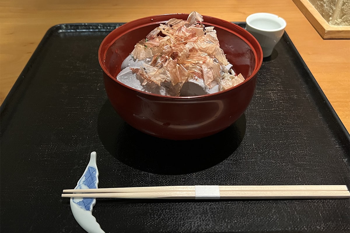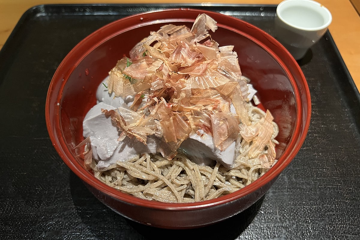一緒に行った同僚が頼んだとうふそば。粗挽きの蕎麦殻の粒々がこれまたおいしそうな細いそばと、食べる直前に削っているという、旨味の凝縮されたフレッシュなかつおぶしがたっぷり乗せられている1杯だ。