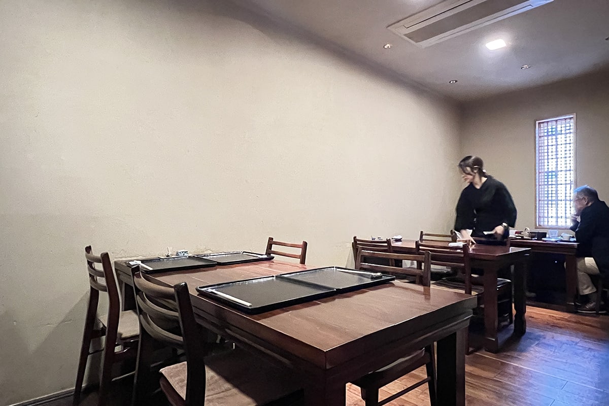 一見するとそば屋とは想像がつかないモダンな外観。これは食べ終わったあとに撮った写真なので人はいないけど、到着したのは12時半ごろ。お昼時ということもあって8組ほどが列をなしていた。コロナ禍以後、昨今ほどのインバウンドバブルが起きる以前から外国人のお客さんが多いのも特徴。