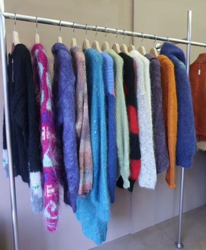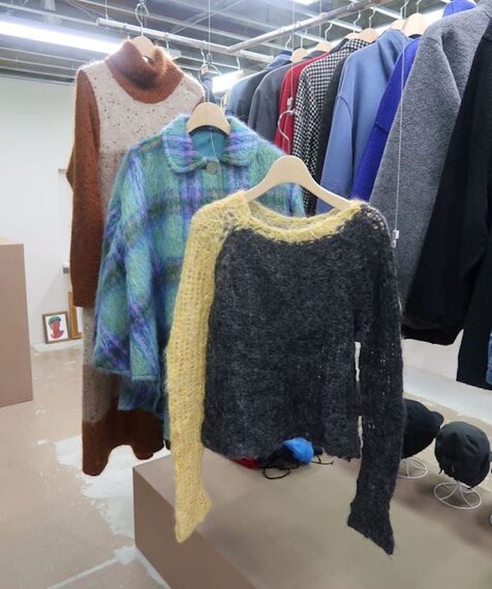 入り口の脇に並べたモヘヤのセーター。幅広い世代が興味を持って手に取る