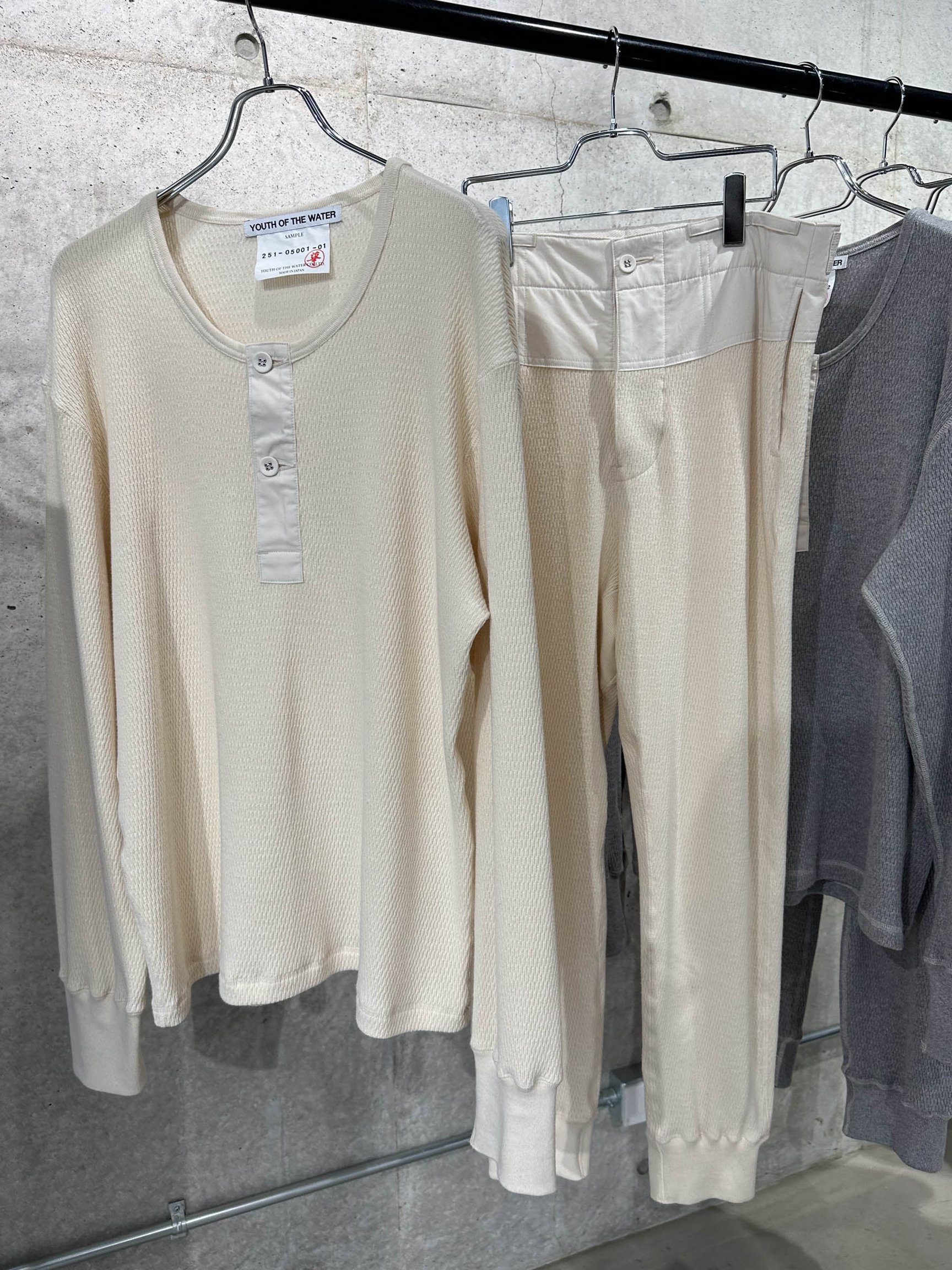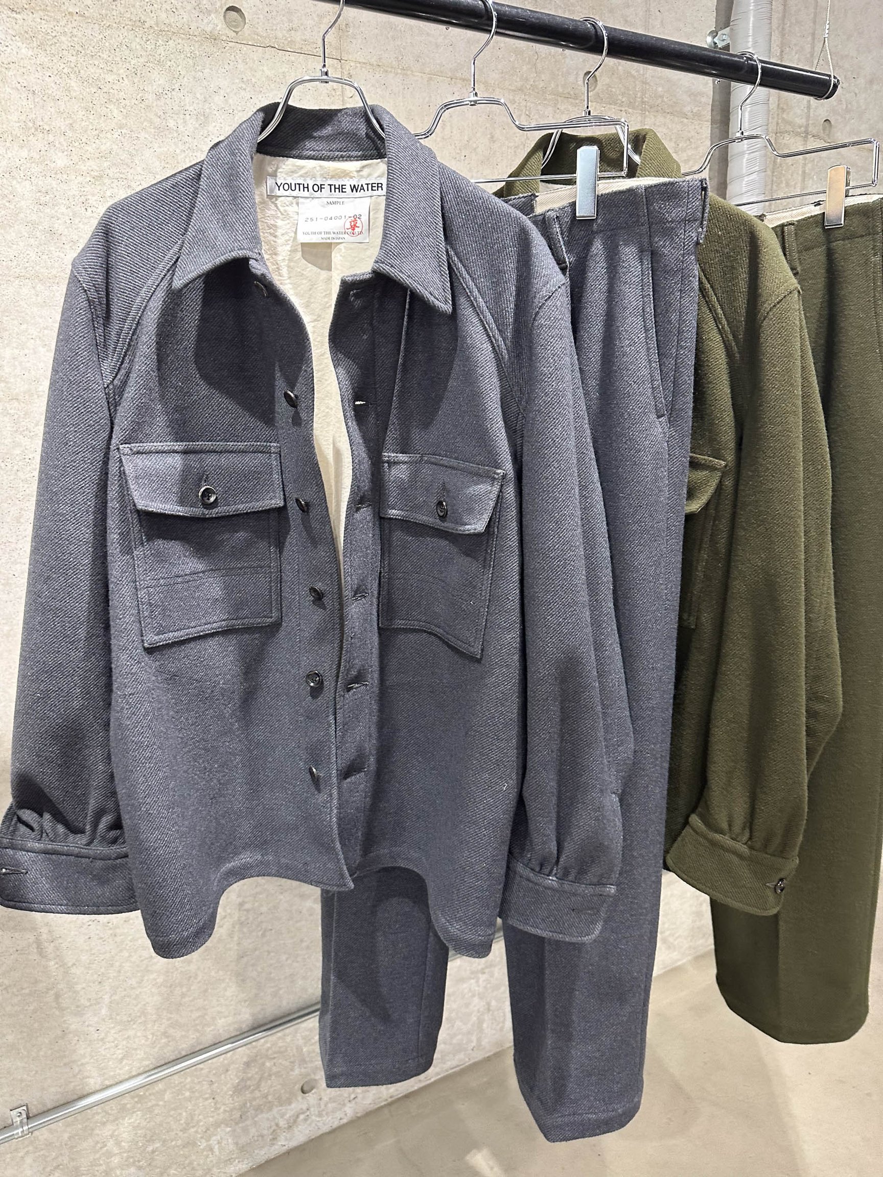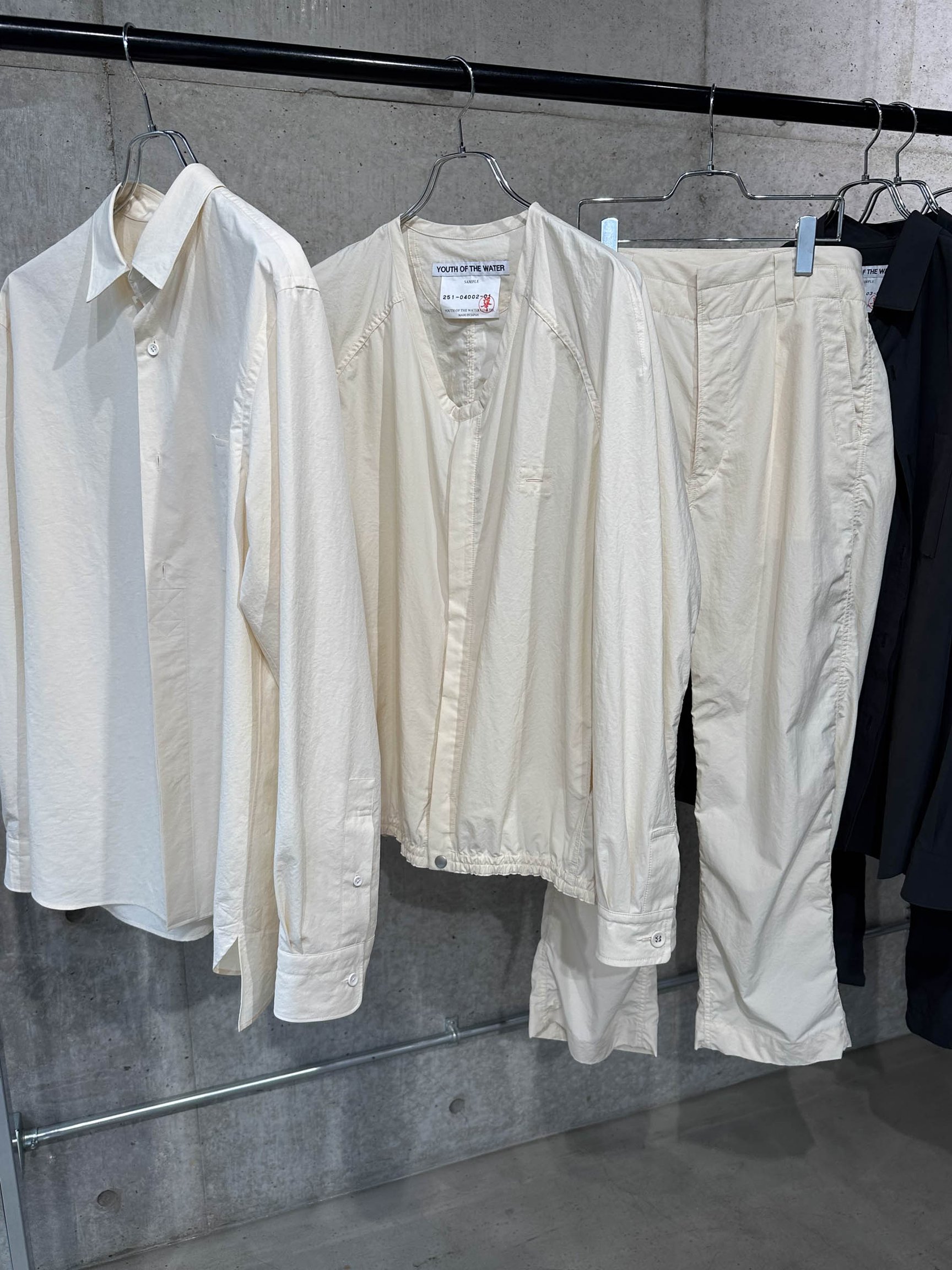 100%GIZAコットンを使用した「生機」と呼ばれる綿本来の色や風合いを持つコットン素材にバイオ加工を施しオリジナル生地を製作。一般的な綿花は機械で採るため綿花由来のゴミが混ざったまだらな状態を味として表現することが多いが、一つ一つ手摘みで採ることで混じりけのない生機に仕上げている。同生地ではシャツ(4万1800円)、ジャケット(5万600円)、パンツ(4万6200円)を仕立て、ドレスシャツは、ワークウェアで多く用いられるダブルステッチや腹部のみボタン合わせを比翼仕立てにするディテールを採用。ジャケットは空軍のラインマン(飛行機の着陸を地上から補佐する人)が着用していたアイテムのパターンを踏襲し、より腕の稼働を広くとったパターンを作成した。パンツは、デニム等の厚手の生地で多く用いられる巻き縫いを薄手の生機生地に施すことで縮み皺を生み出した。