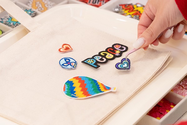 オリジナルのイラストやマークなど、規定のサイズ内であれば自由にデザインしてOK。完成したデータをもとにデジタルミシンで刺繍し、その場でワッペンを作ってもらえる。