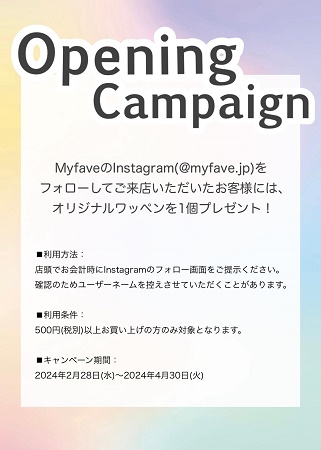「My fave」では、4月30日(火)まで、500円(税別)以上購入した人を対象に、オープニングキャンペーンを実施している。