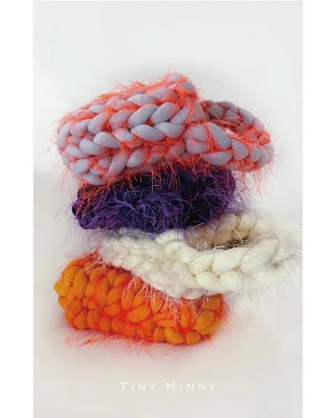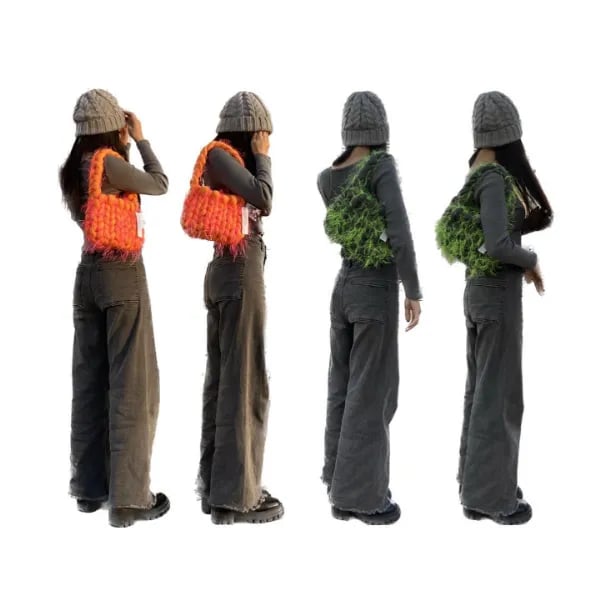 minnmny:チャンキーニットとモケモケ素材の糸を一緒に編んで作った「MOKE BAG」です!自然界にある、派手な色同士が組み合わさっているキノコなどからインスピレーションを得ました。