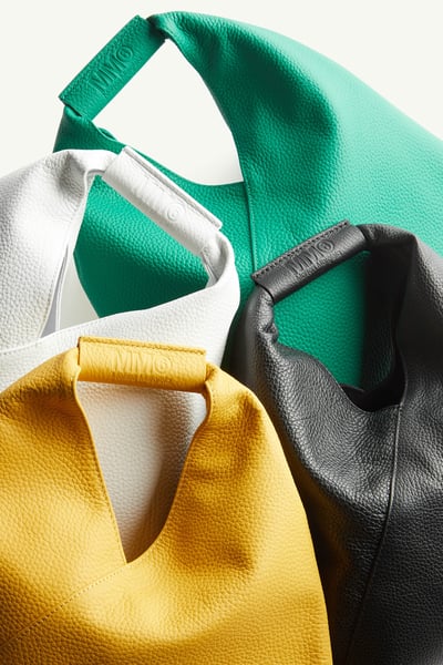 ジャパニーズバッグは折り紙から着想を得ており、三角形のシルエットと角のホ?タンにより、鶴になる折り紙のように折りたたんて?形を変えることか?できる。