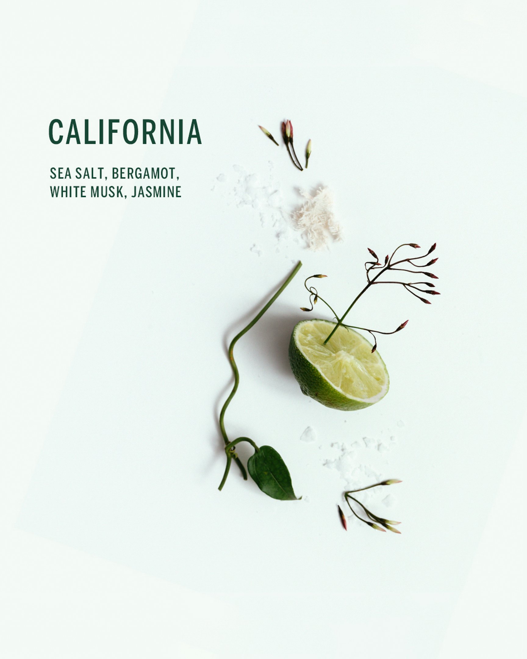 シダー、ホワイトムスク、ジャスミン、グアイアックウッドによる、温かみのあるスモーキーな香りが繊細な花々とハーモニーを奏でるユニークな香り。 - CALIFORNIA