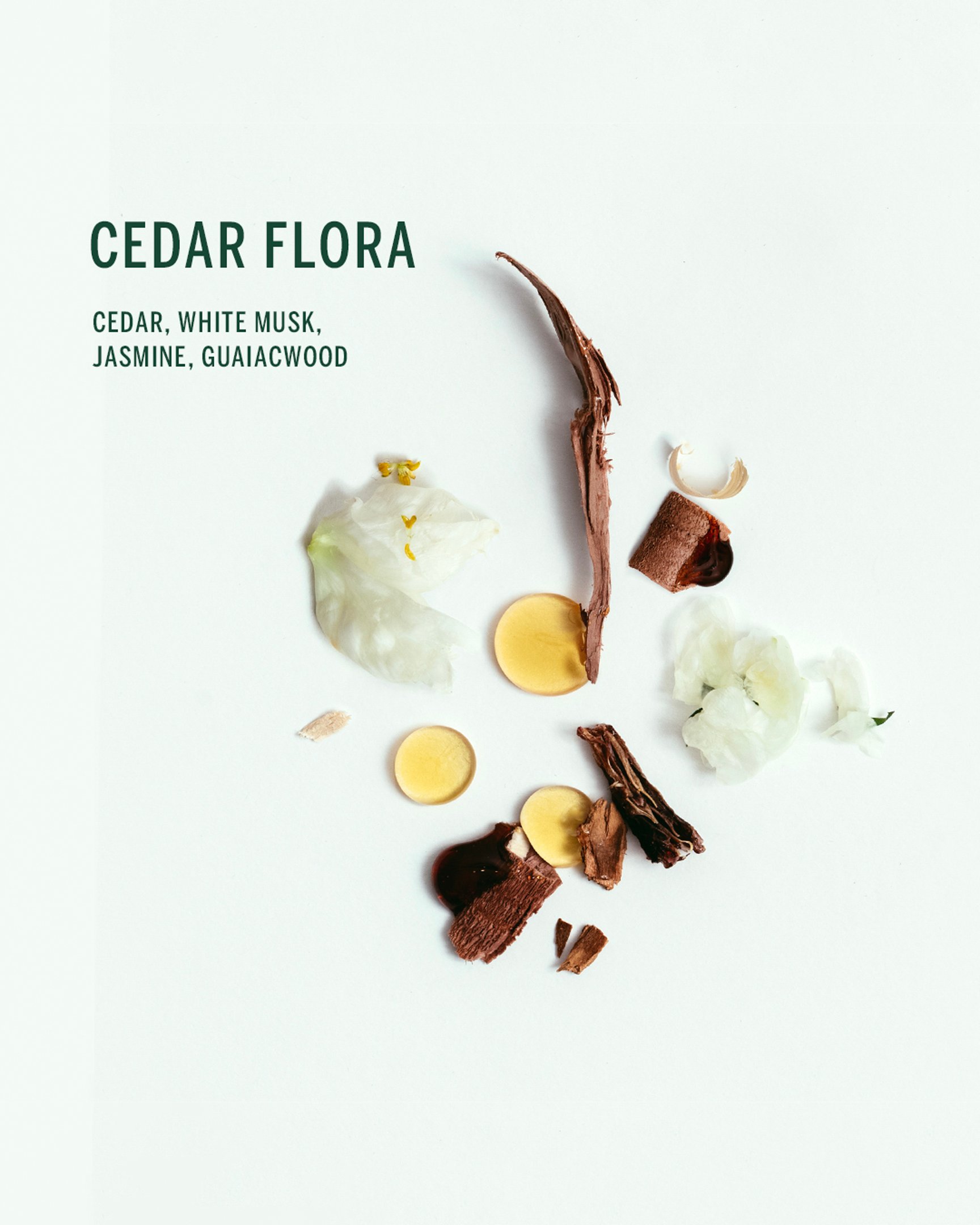 ローズ、イタリアンマンダリン、バイオレット、シダールートを採用。ほのかな柑橘のニュアンスと繊細な木の香りがバランスよく調和した、洗練されたローズの香り。 - CEDAR FLORA