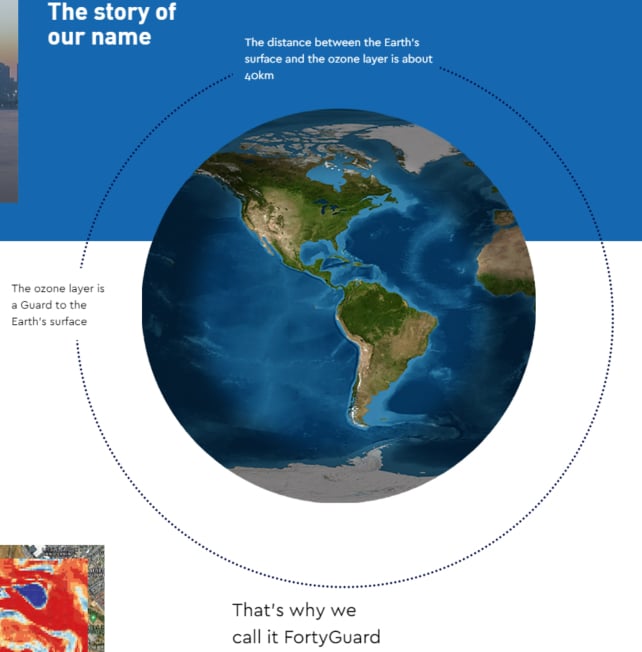 FortyGuard公式サイトには、社名自体に強い理念が反映されている。地球の表面からオゾン層までの距離が約40(Forty)kmで、オゾン層は地球の表面の守り手(Guard)であることから、社名を「Fortyguard」と命名したという。