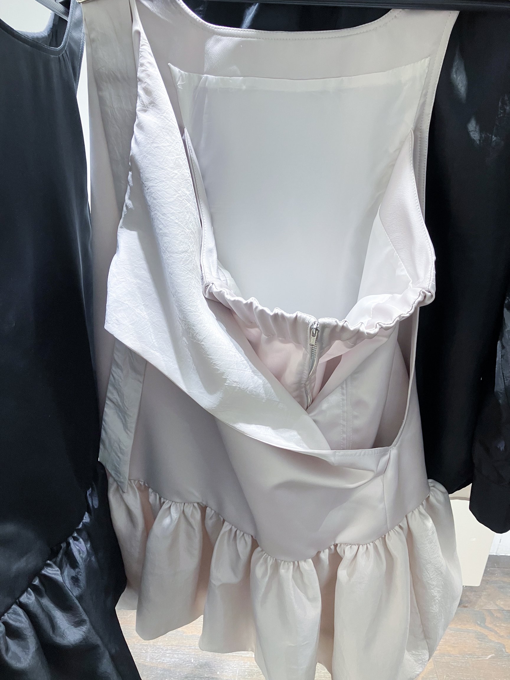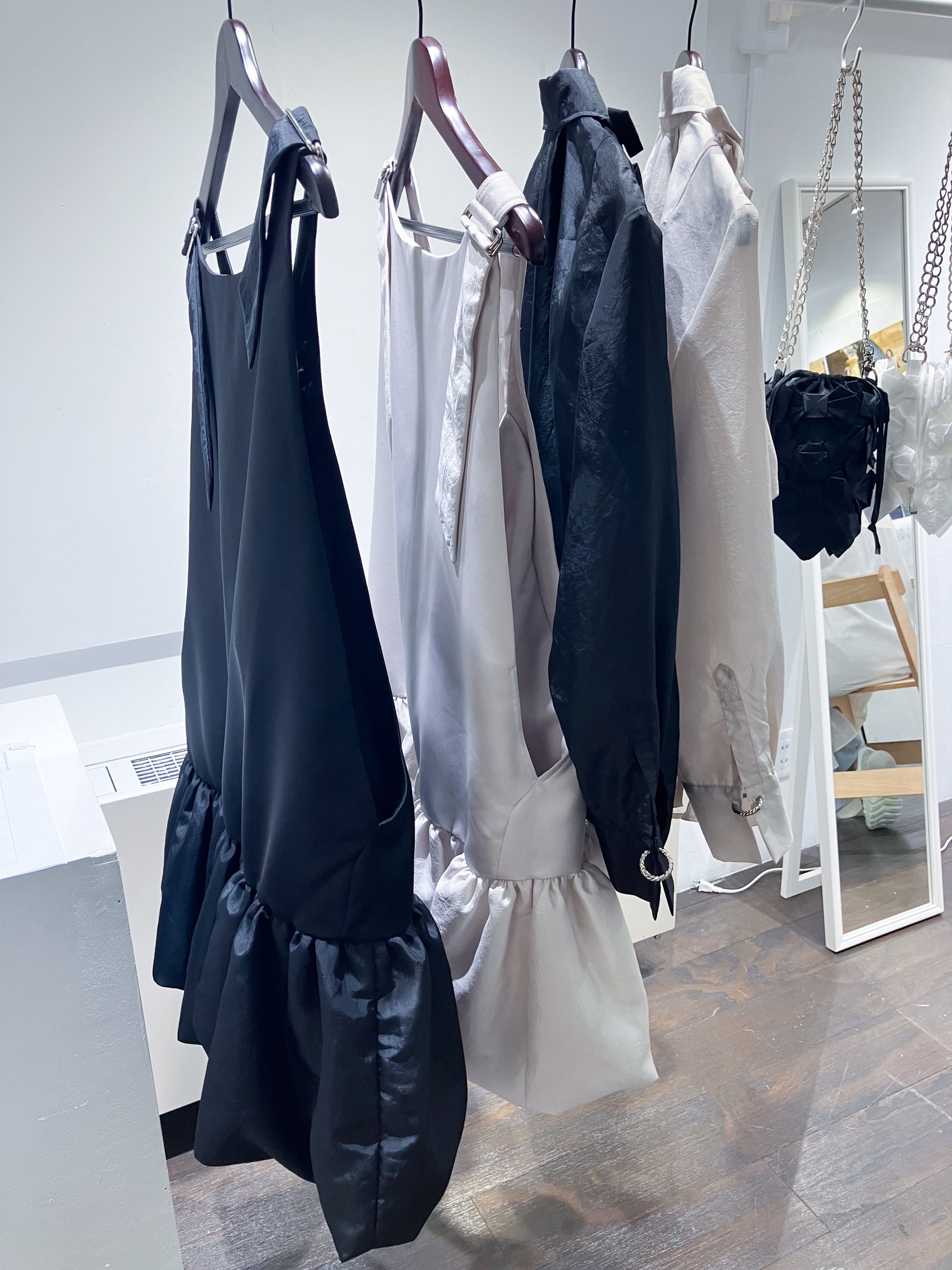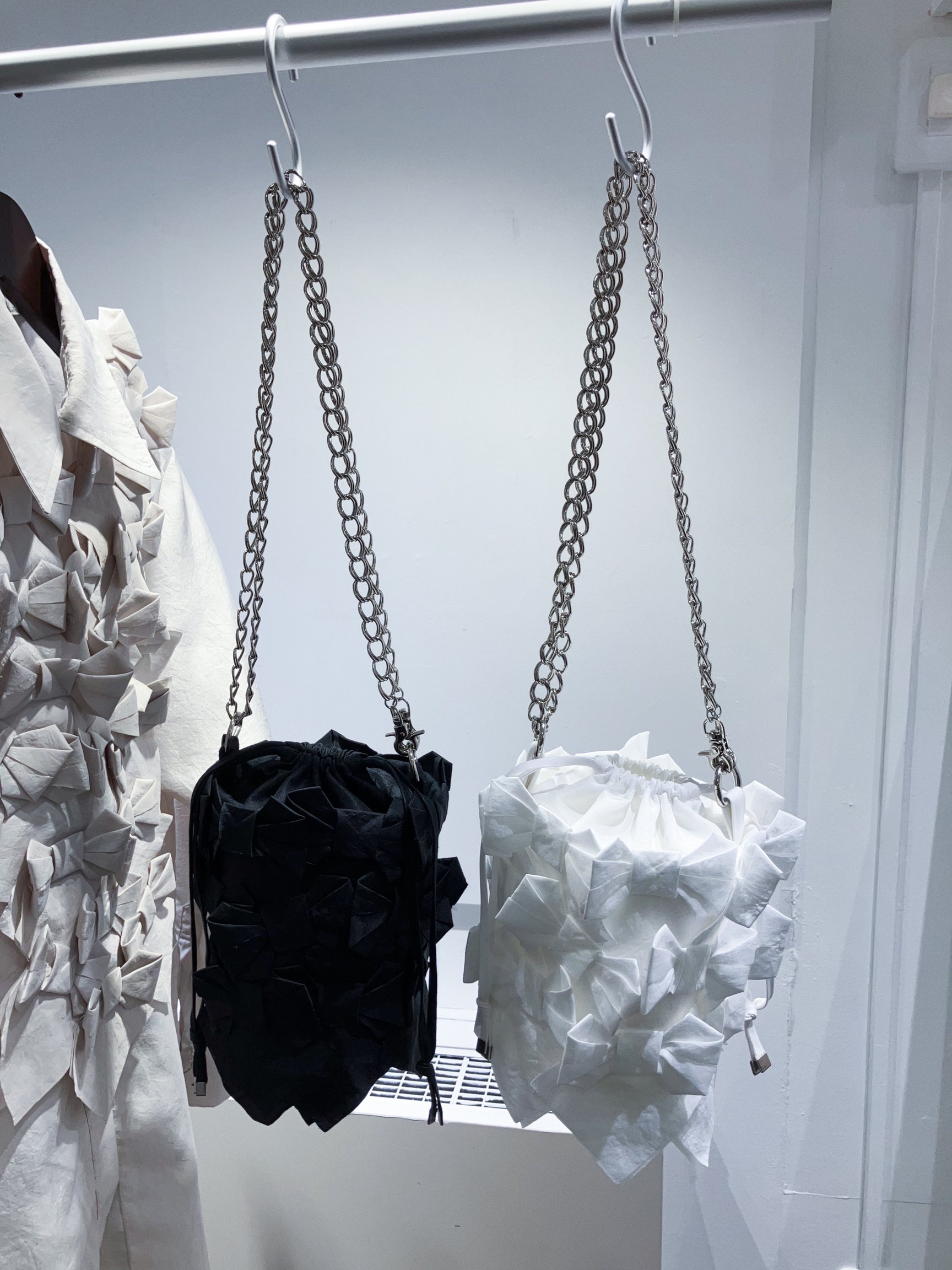 ファーストコレクションでは、シグネチャーの「リボン」モチーフをふんだんにあしらったアイテムを中心に、イタリア留学時代に学んだオートクチュールのテクニックやエッセンスを落とし込んだウェアとバッグ、計7型を展開。デザイナー自身が手作業で製作しているという約20個のリボンモチーフをあしらったシリーズからは、シャツ(5万9400円)とコート(12万1000円)、チェーンバッグ(3万8500円)をラインナップする。スカート部分がバルーンシルエットになったドレス(5万8300円)は、前身頃の内側にコルセットのようなディテールをデザインし、オートクチュールの要素を取り入れた構築的なシルエットに仕上げた。