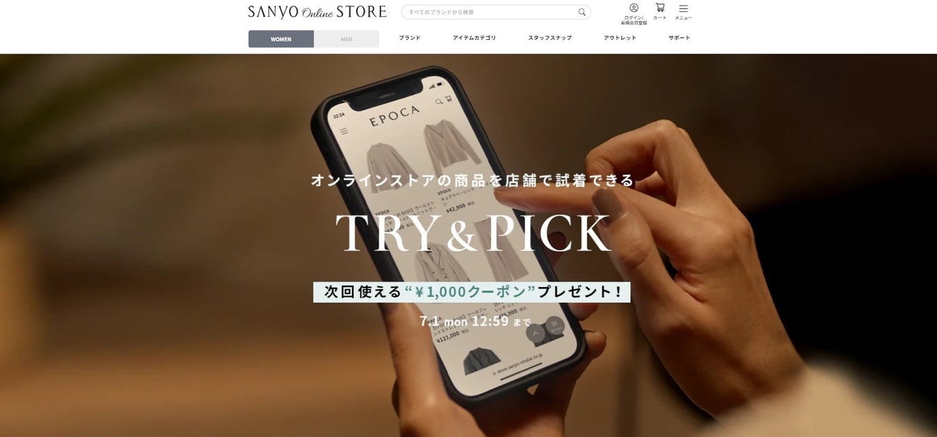 同社は昨年9月、自社EC「サンヨーアイストア」に新たなECプラットフォームを導入してリニューアル。ブランドごとに点在していたブランドサイトと通販サイトを統合し、「サンヨーオンラインストア」として始動した。同時に、実店舗とEC上の在庫を指定の店舗に取り置き、試着?購入ができるサービス「トライアンドピック」を実装した。