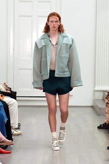 レオン:3ブランドともとても良かったと思う。チャールズはスタジオもあるサマーセットハウスの中庭で大きなショーをした。10周年記念ということで、これまでの作品へのオマージュもありながらも、若手のコレクションというよりぐっと大人の服になった感じがした。おとぎ話のラブストーリーのようなイメージ。シャツをベースに再構築した服にはじまって、胸に弓矢が刺さっていたり、バナナの皮が剥けたような靴があったり。その後ミリタリーに移る。ストーリーがありながら1つ1つのルックがしっかりしていた。正面の建物のバルコニーで大きな帽子を被った人たちが演奏したりしている様子はお城のようだった。