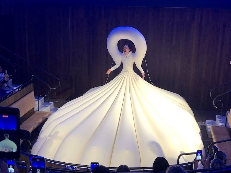 若月:会場は英国王立アカデミーのコンファレンスルーム。会場に入ると階段上に設置された客席に囲まれたステージいっぱいに白い物体が置かれていた。速報でマスイユウが「小籠包のような巨大なラテックスの立体物」と書いていたけれど、上手い表現だと思う。その小籠包はスカートで、スイスのシンガー、モネがその中にすっぽりと入ってドレスを完成させ、歌を披露するというパフォーマンス。