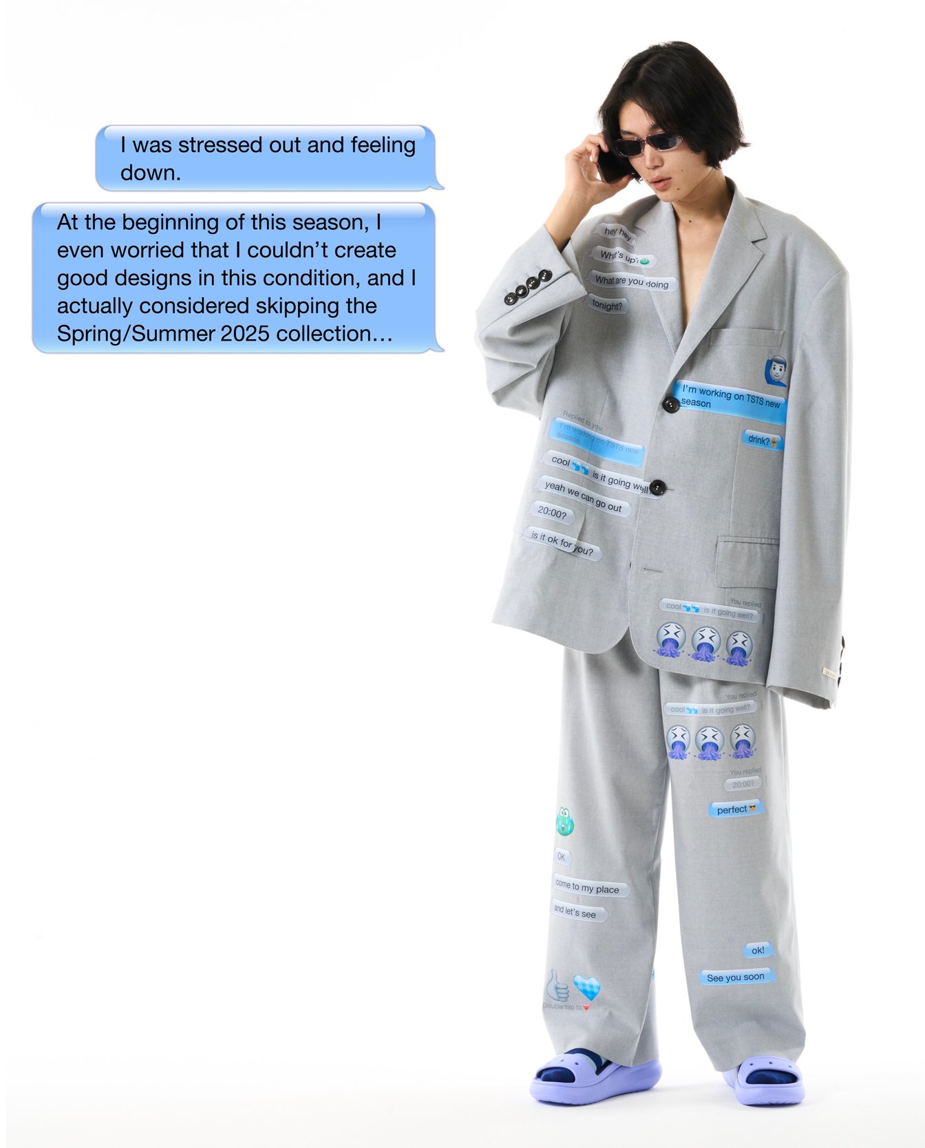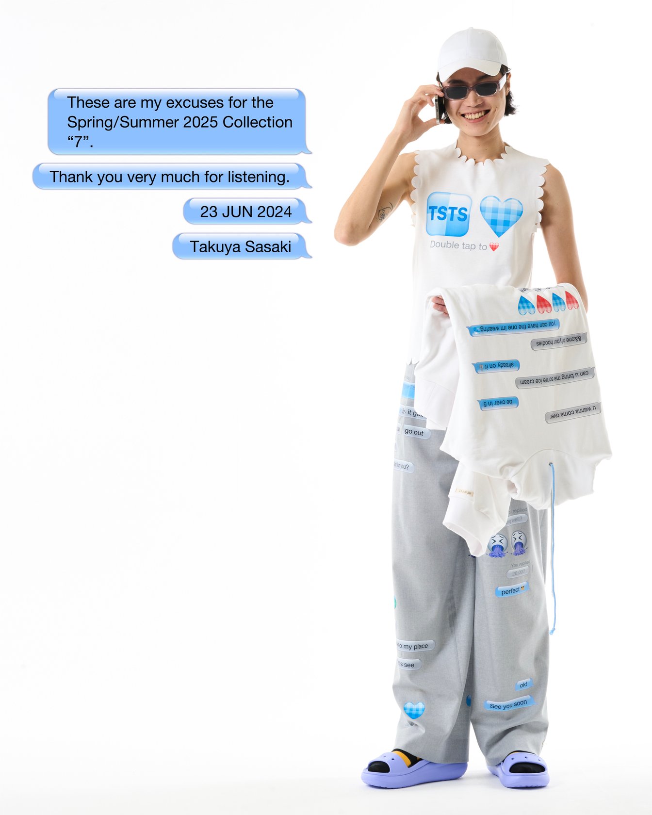 最新の2025年春夏コレクションは、京都市京セラ美術館で開催されていた村上隆の個展「村上隆 もののけ 京都」に登場した作品「言い訳ペインティング(未完成の作品を村上のキャラクターがカンガのセリフのように解説や言い訳をしている絵画作品)」に着想。コレクション製作に行き詰まる中でその作品に出会い、「心が軽くなった」ことを受けて「無理をしない」ことをテーマに設定した。
