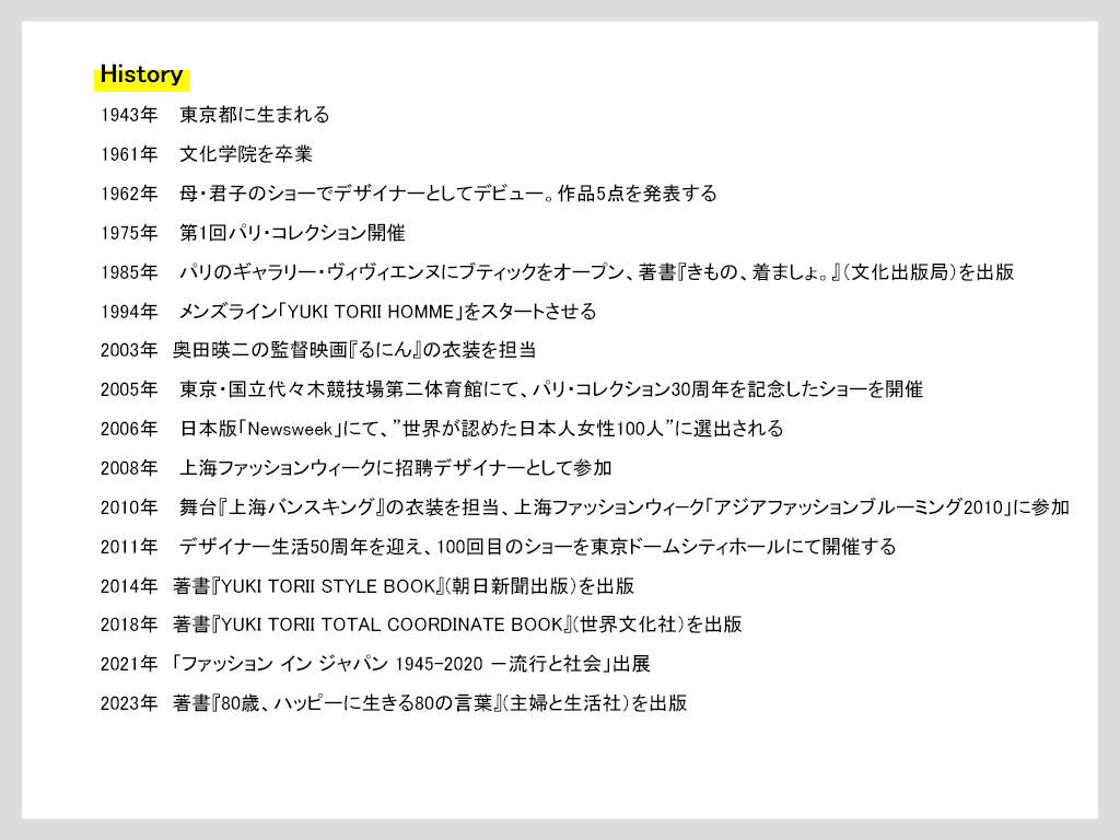 鳥居は1943年、東京で誕生。祖母?母もデザイナーという家庭に生まれ、幼少時からファッションに触れて育ちました。中学を卒業すると文化学院の美術科に3年飛び級で入学。卒業後、1962年には母?君子のショーの中で作品を発表し、デザイナーとしてのデビューを果たします。 その後は、年に2回のコレクション発表を行いながらテレビドラマや劇団四季の衣装デザインを担当し、1975年に初めてフランス?パリでコレクションを発表。1984年にはファッションブランド「ユキ トリヰ」を発足させ、翌年にはパリのギャラリー?ヴィヴィエンヌにブティックをオープンします。1994年にはメンズライン「YUKI TORII HOMME」をスタートさせ、2005年には国立代々木競技場第二体育館でパリ?コレクション30周年を記念したショーを開催しました。2011年にはデザイナー生活50周年を迎え、同年10月に100回目コレクションの発表を達成。現在もコレクションや衣装のデザインのほか、著書の執筆など精力的な活動を展開しています。
