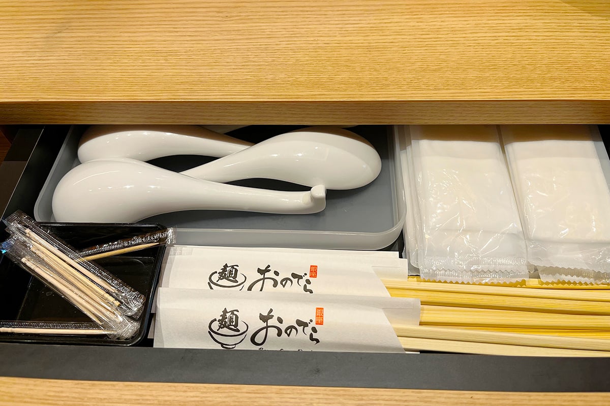 麺が折られた盛り付けはおいしい予感...!ビジュアルの美しさに目を奪われていたら、顔を近づけなくともスープの旨みが漂ってきた。お箸やレンゲは引き出しに入っています、と店員さんから丁寧にアナウンスされて、食べる準備は整った。