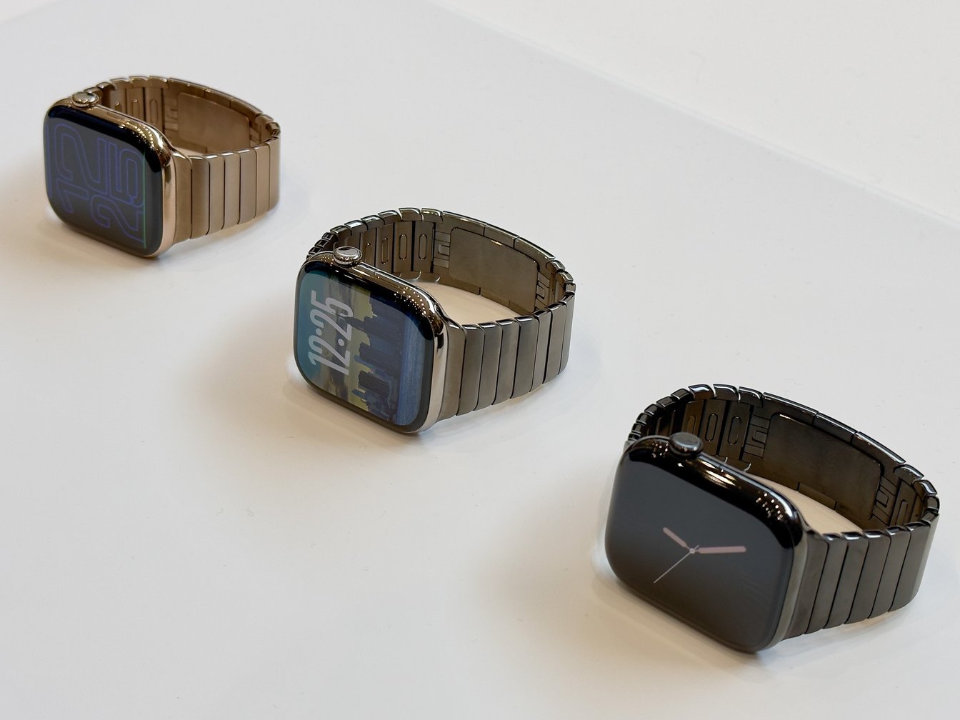 頑丈さと軽量さを両立し光沢も美しいApple Watch series 10チタニウムモデル。本体色に合わせたリンクブレスレットバンドも用意された。