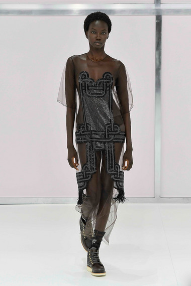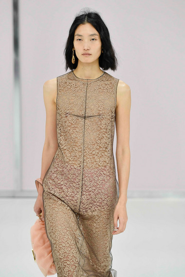 フェンディはチュールの透け感と、ベルベットやスエードタッチの膨らみと光沢のコントラストで見せる。エレガントなドレスをワークブーツと組み合わせて、軽快でロマンティックに仕上げた。ストレートシルエットのチュールドレスはグラフィカルな装飾がのせられる。