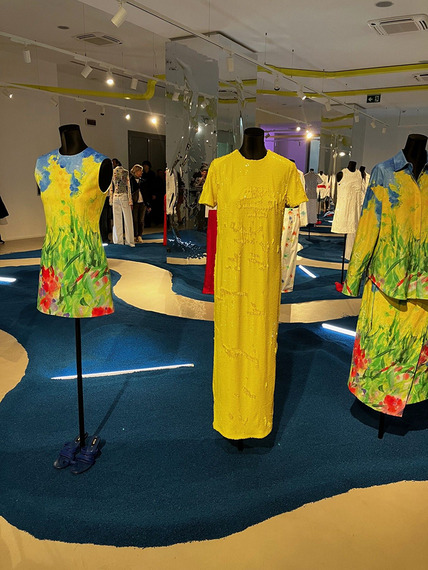 MSGMは、青い砂を敷き詰めた会場で軽やかな夏のムードをはらんだコレクションを見せた。豊かな自然を描いた絵画をプリントしたドレスや建築の要素を取り入れたグラフィックドレスがキーアイテム。そこに、夏の海のきらめく光を思わせる装飾をきらきらとしたスパンコールで描く。草花を描いた絵画は、マッシモ?ジョルジェッティの友人でもあるルカ?デ?ガエタノによるもの。グラフィカルなテープをコントラストにしたドレスは、マリオ?ベリーニの椅子からイメージしたものだ。ギャザードレープとアシンメトリーなフリル、ペプラムディテールを利かせたドレスやトップも充実した。