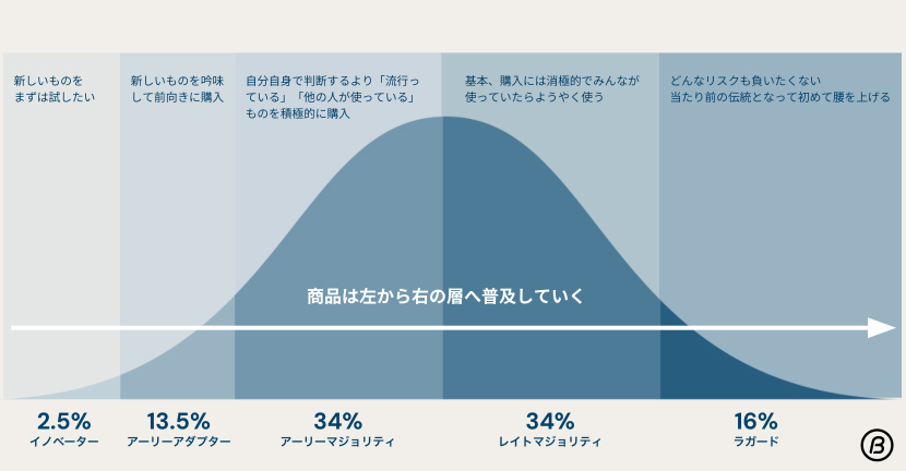 新商品が普及していくのは、一般的にイノベーター、アーリーアダプター、アーリーマジョリティ、レイトマジョリティ、ラガードの順であると考えられる。