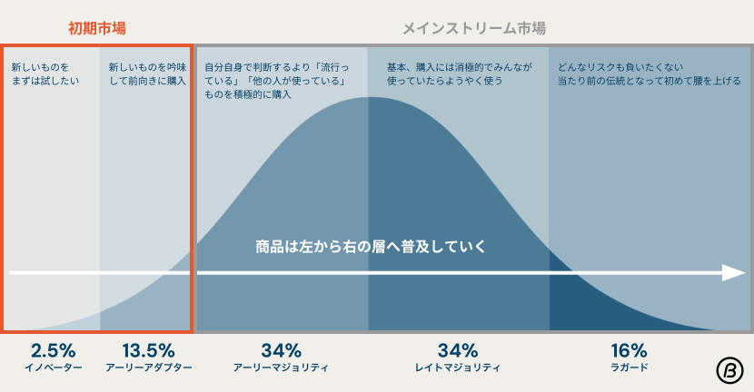 それぞれのグループは、初期市場、メインストリーム層と呼ばれる。一般的には、イノベーターやアーリーアダプターが「初期市場」を形成し、アーリーマジョリティ、レイトマジョリティ、そしてラガードが「メインストリーム市場」と言われる。