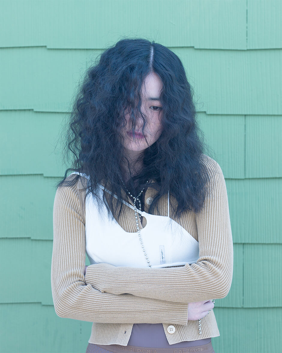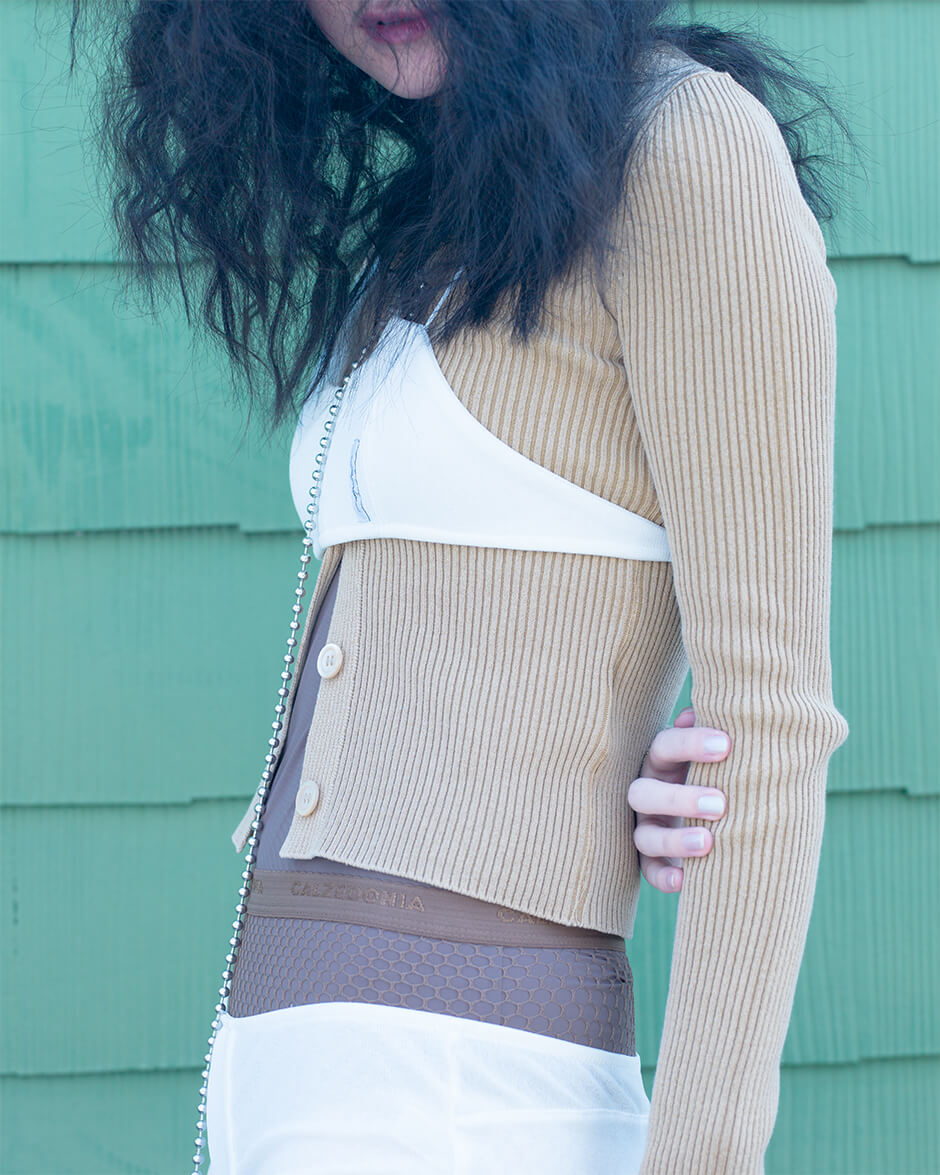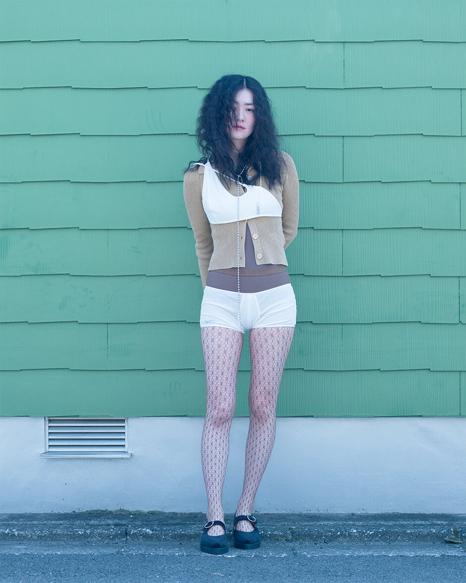 bra and shorts by SOEUR TOKYO, cardigan by OUR LEGACY, bodysuit by MAISON MARGIELA, shoes by ANIMUS, tights and necklace stylist’s own