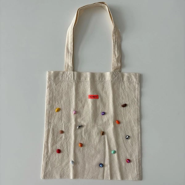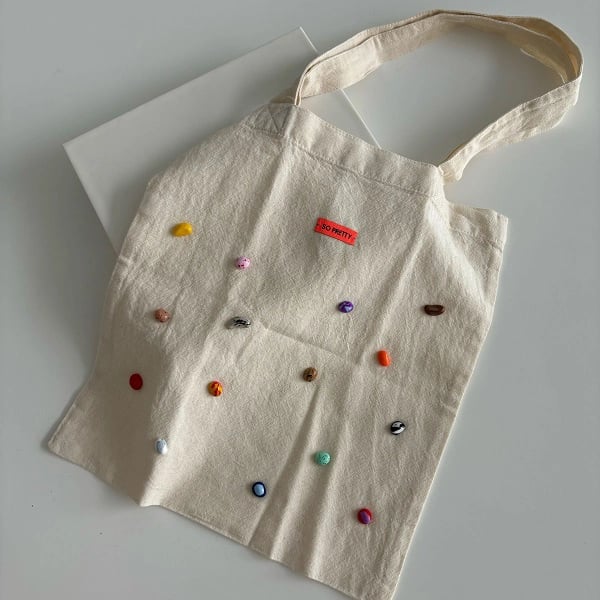 写真のバッグは、たくさんの粒を散らしたデザインの「SO PRETTY bag」です。