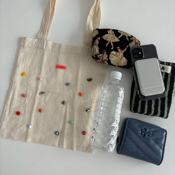 例えば写真のバッグは、縦29cm×横27cmあり、500mlのペットボトル、ミニ財布、iPhone、ハンドタオル、ポーチなどが収納できます。ちょっとしたお出かけに便利なサイズです。