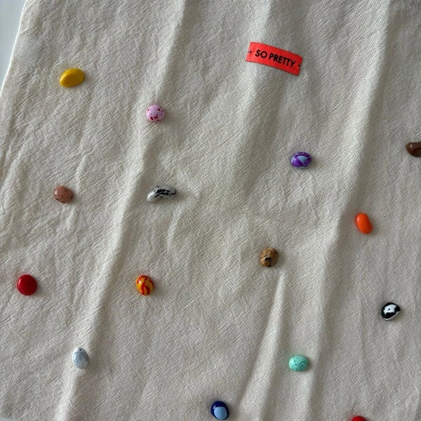 色や柄、形がバラバラの粒は、ファンタジーな石をイメージして作っているといいます。複数の粒が集まると、よりカラフルでポップな見た目になるのがかわいらしいですよね。