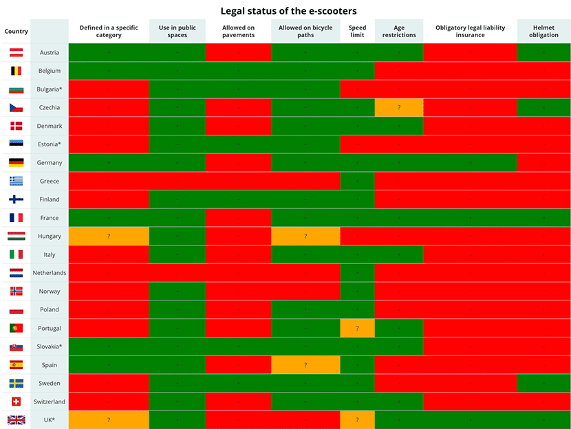 国によって異なるeスクーターへの規制 (参照元: European Road Safety Observatory, FERSI and *Maciej M. Soko?owski (2020))