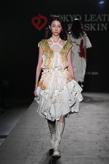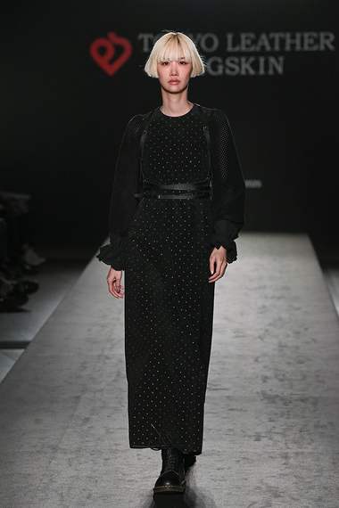 チョノは、テキスタイルの意匠をピッグスキンに落とし込み、クラシックムードのスタイルを見せた。ツイードをプリントしたレザーにスエードを切り替えたノーカラージャケットは、ソフトチュールのティアードスカートを合わせ、異なる風合いのコントラストで見せる。シルバーのドット柄スエードのストレートドレスは、メッシュ状にレーザーカットした袖を付け、袖口をボーラーレースに切り替えた。加工の変化、異素材をバランス良く組み合わせ、シックで軽やか、品のある女性像を表現した。