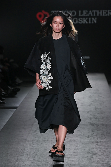 ニーツは和服のパターンを応用したワードローブに、ストリートのベーシックアイテムをミックスした。深みのあるブラックスエードに花を描いたはんてん風ウェアは、ジャージードレスを合わせてシルエットにメリハリを付ける。ジップアップのパーカは、袖や裾をピッグスキンに切り替えてユニークなボリューム。
