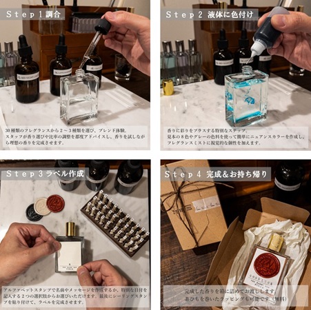「フレグランスミスト制作サービス」の体験フローを紹介しよう。所要時間は40分~50分だ。