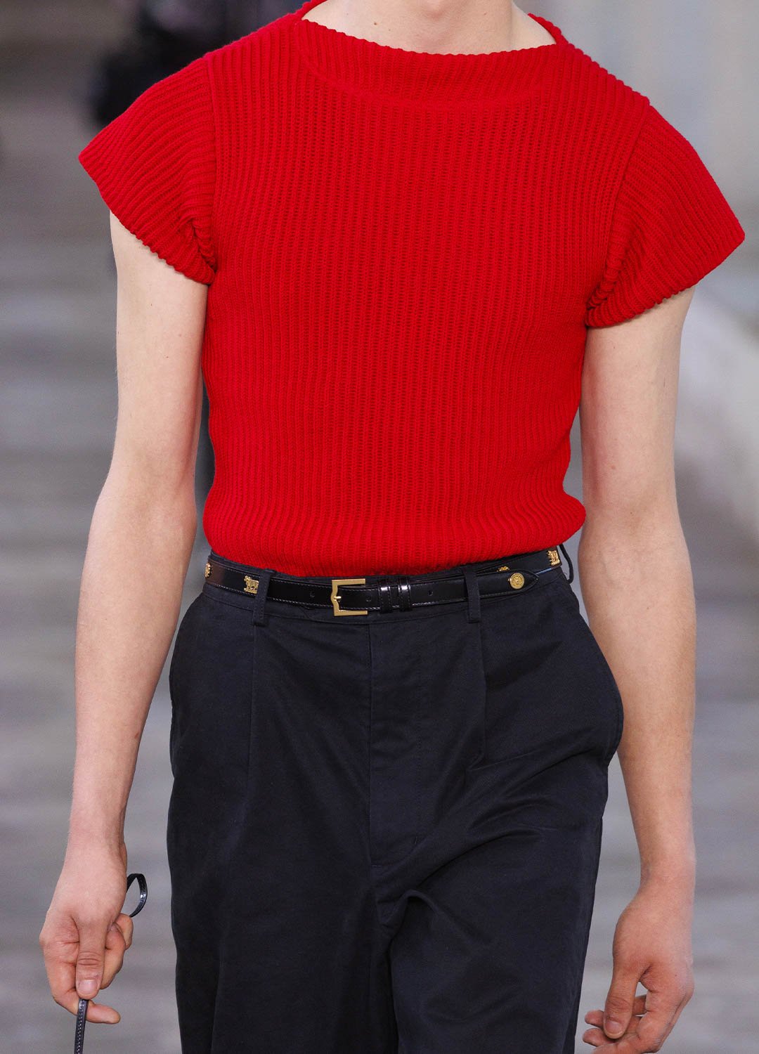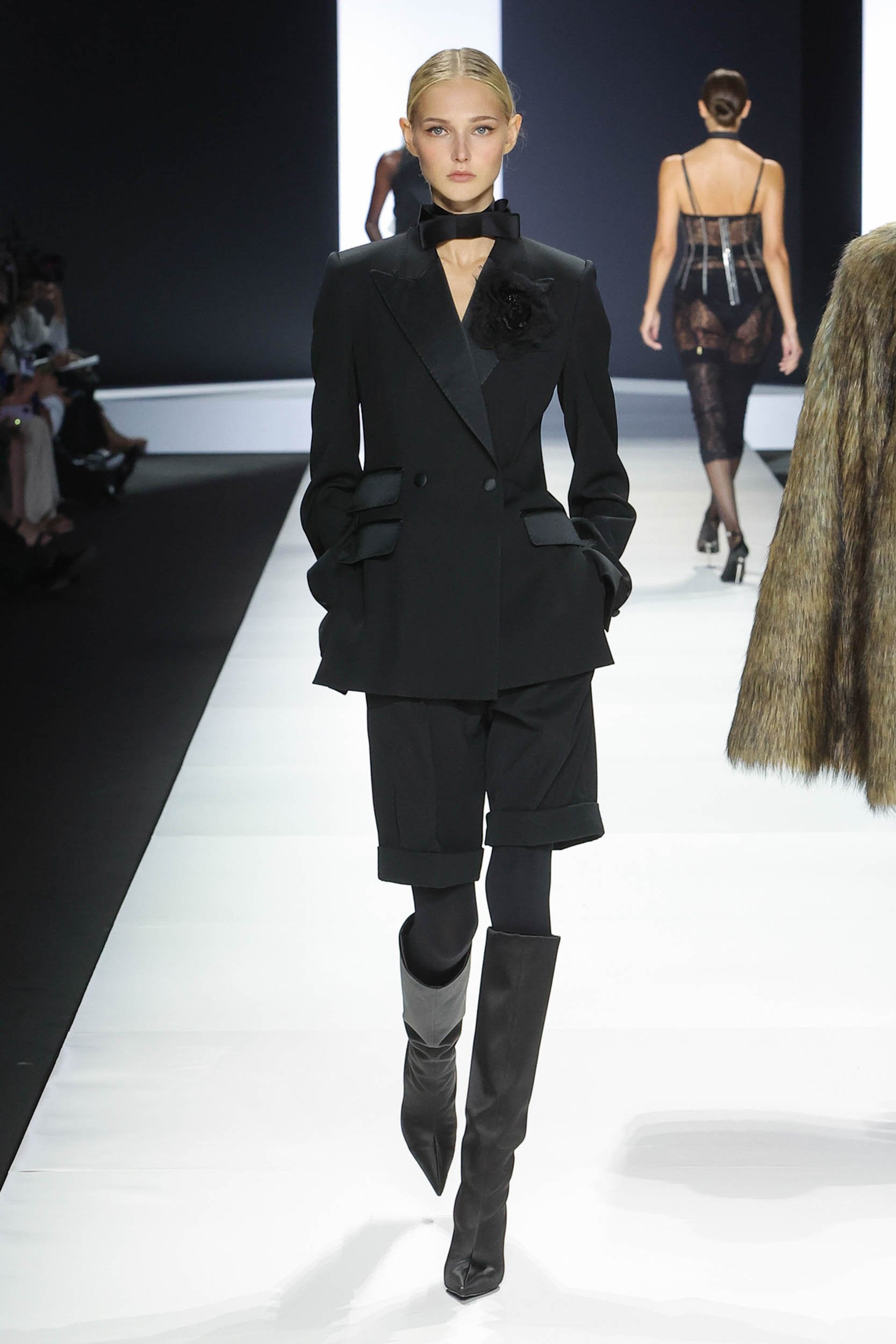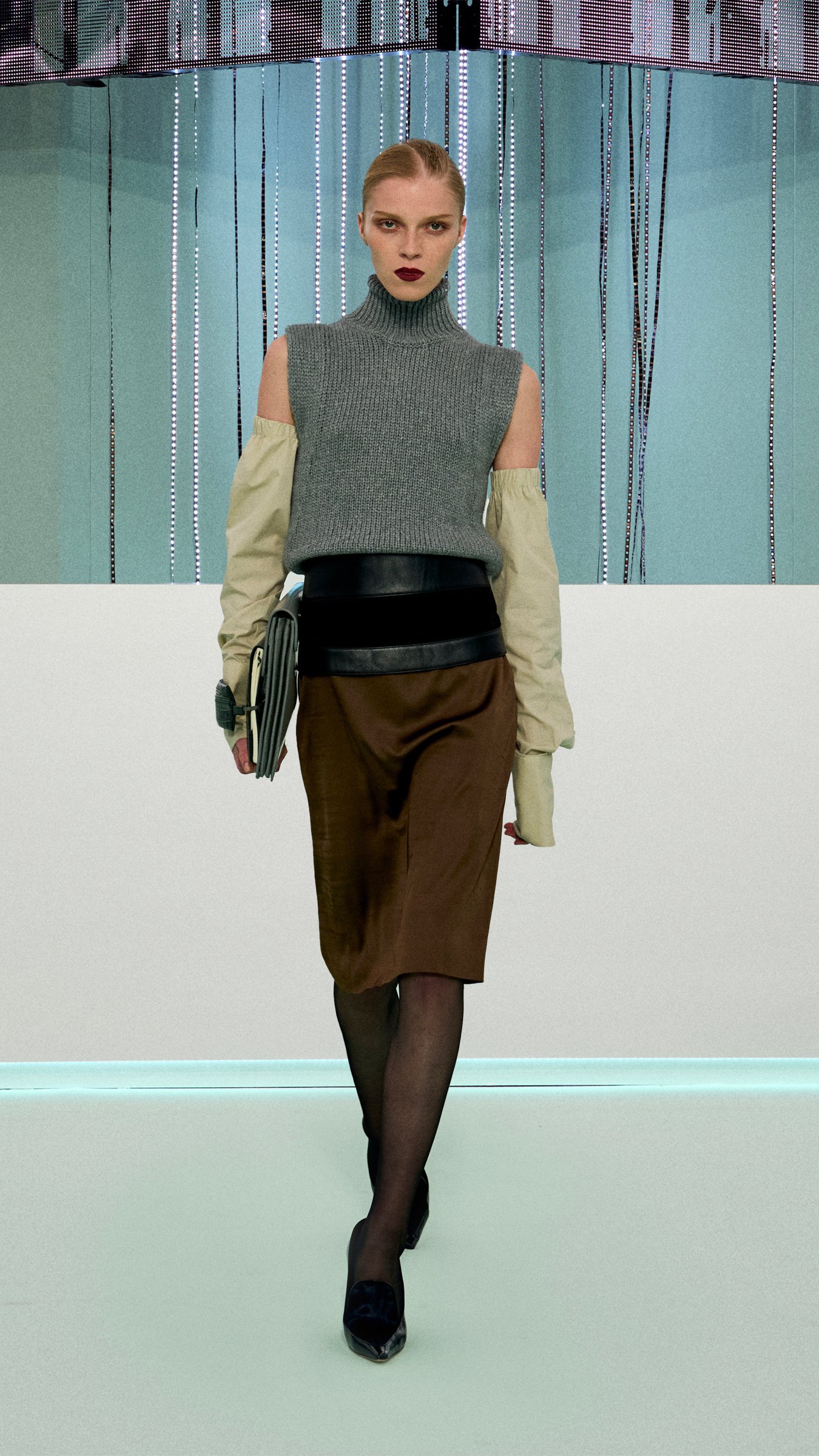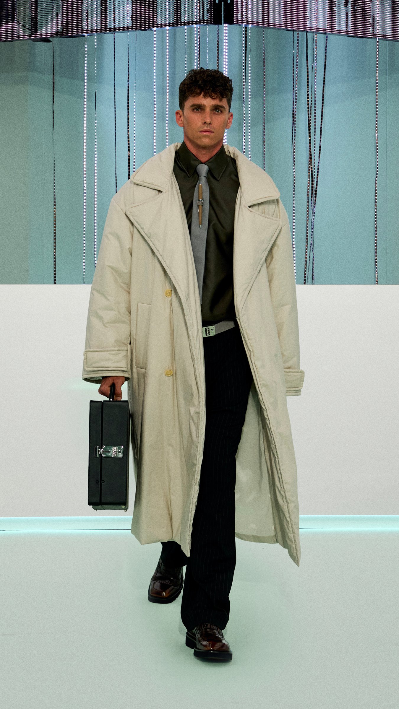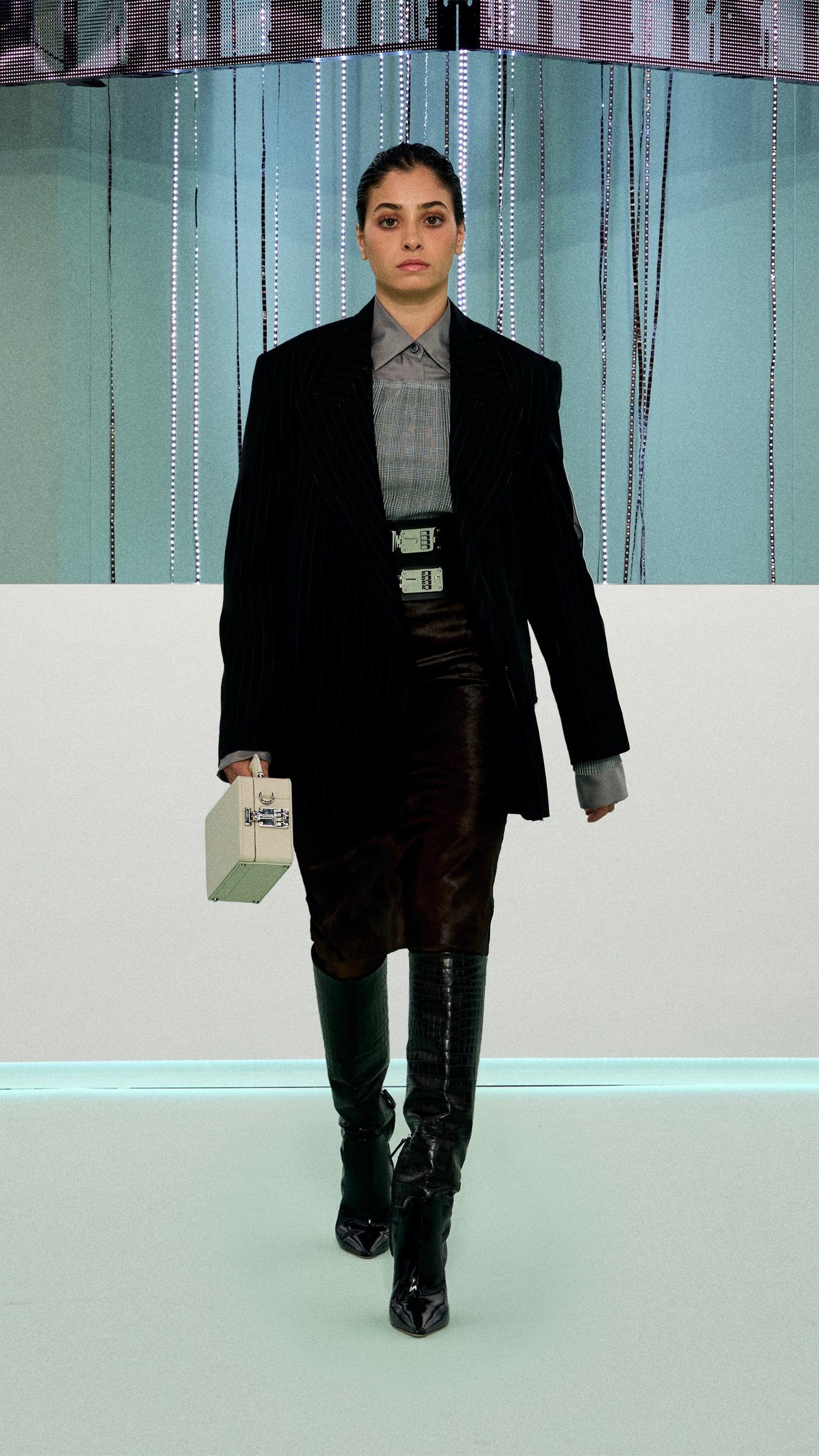 今回ファルチョーニがこだわったのは、ブランドの伝統であるテーラリング。パリッとした素材とシャープなシルエットを採用し、スーツやシャツ、ペンシルスカートといったオフィスウェアをモダンに再解釈。ペーパークリップやペン、フォルダーといったオフィスの備品をアクセサリーとして取り入れ、ブリーフケースに施された数字錠のディテールをウェアにも施すなど、主張あるデザインを生み出していた。