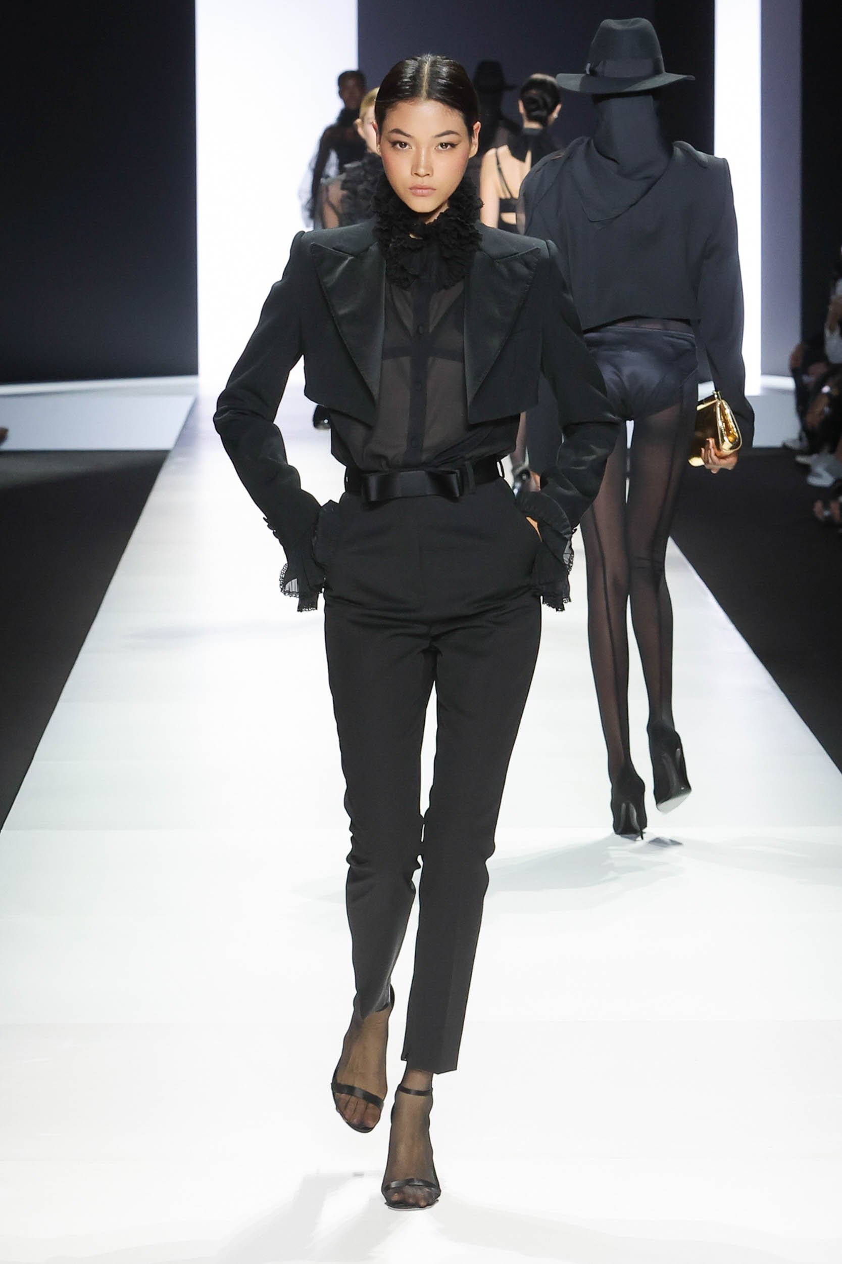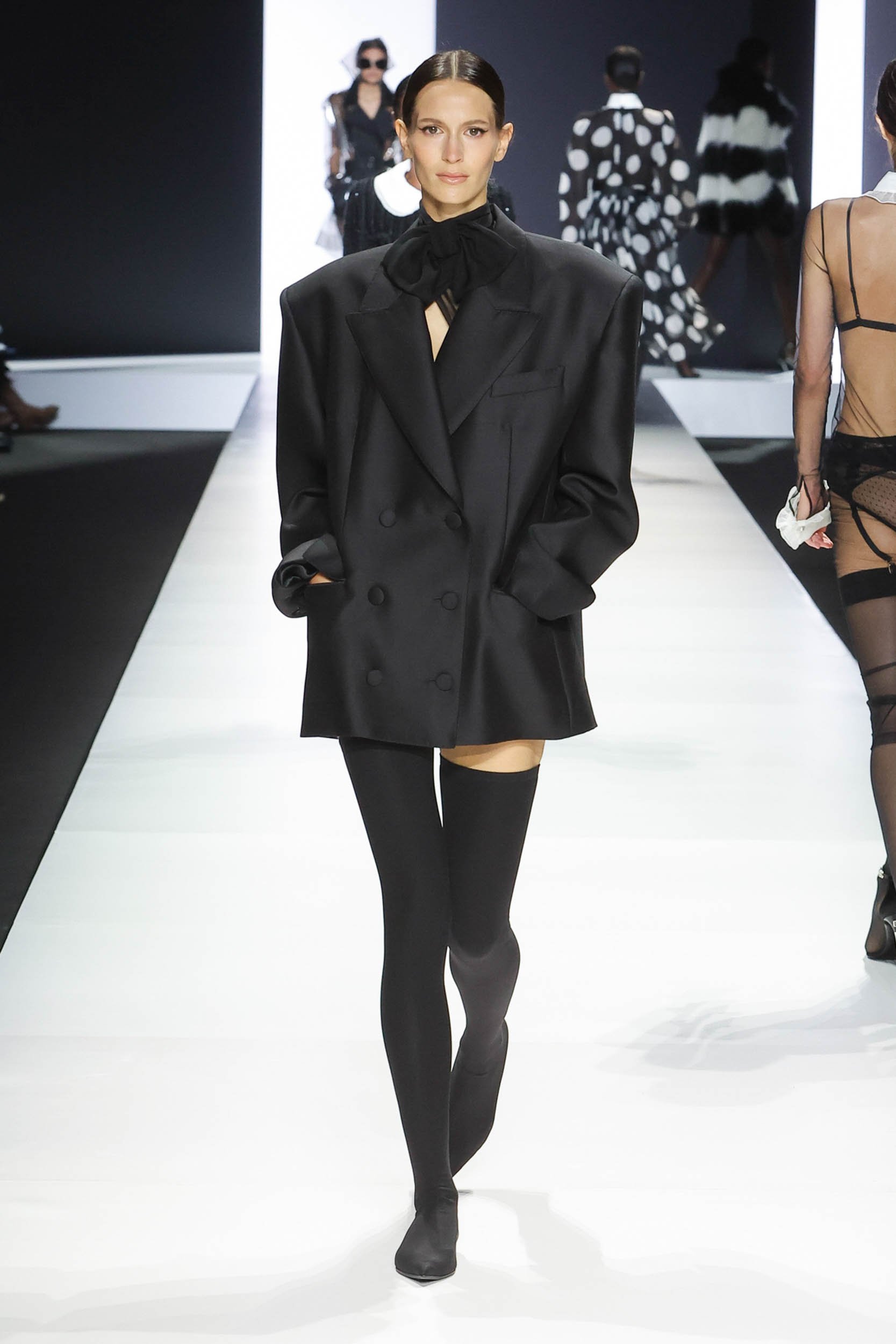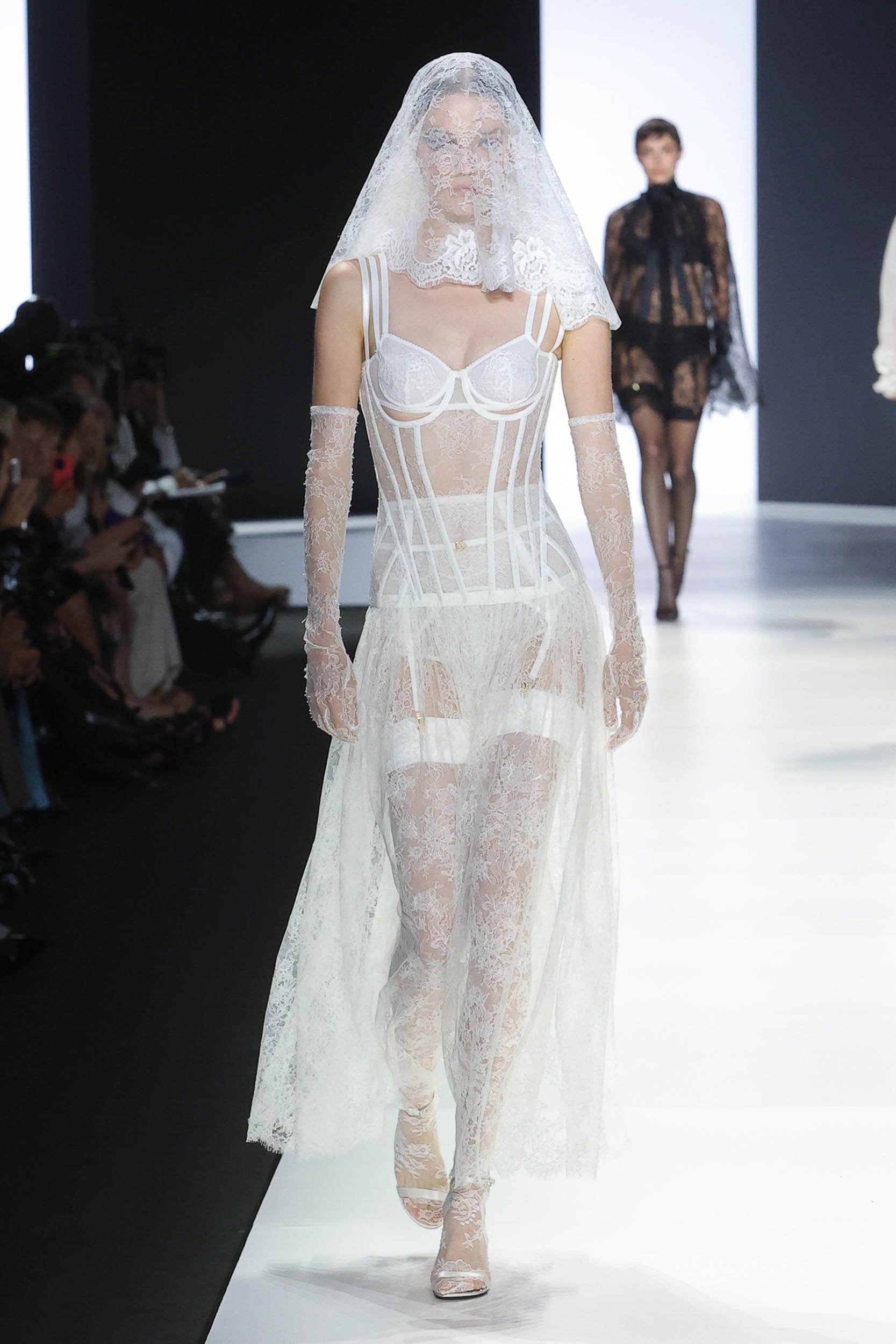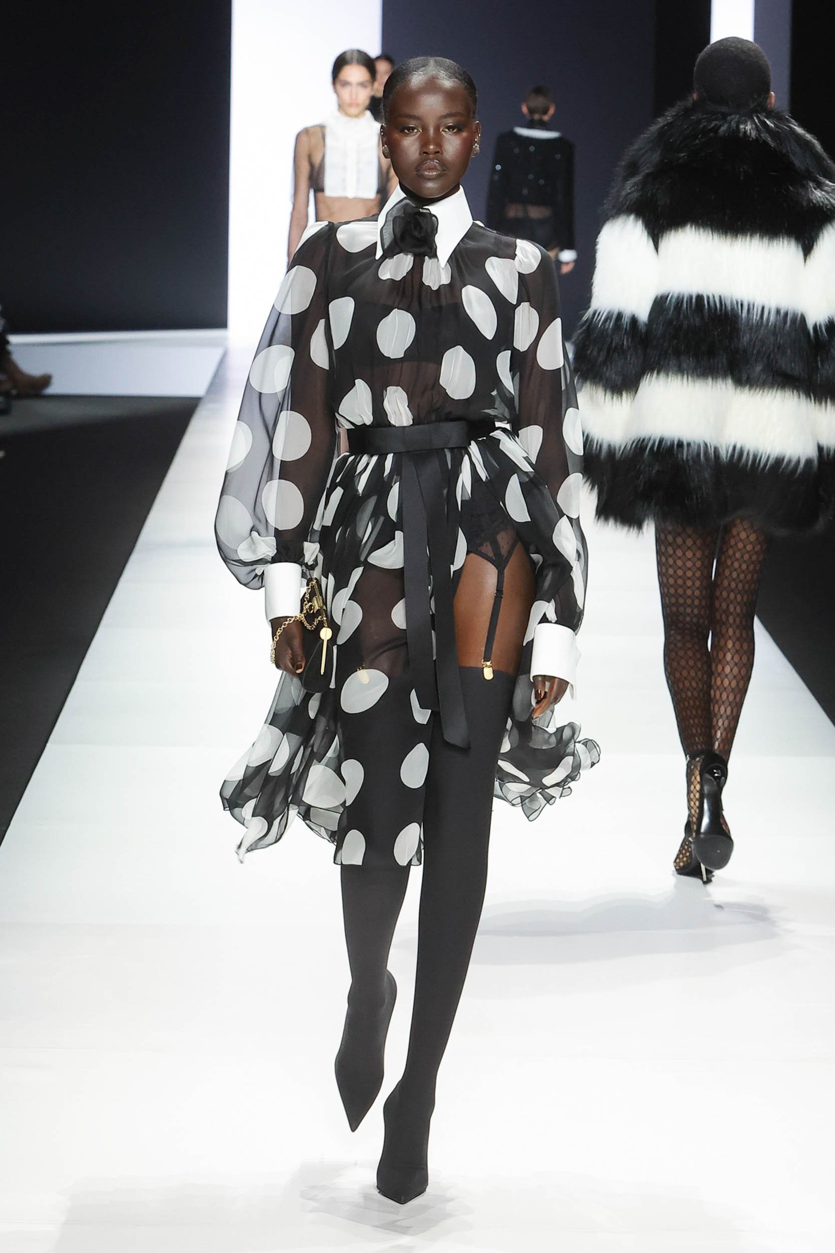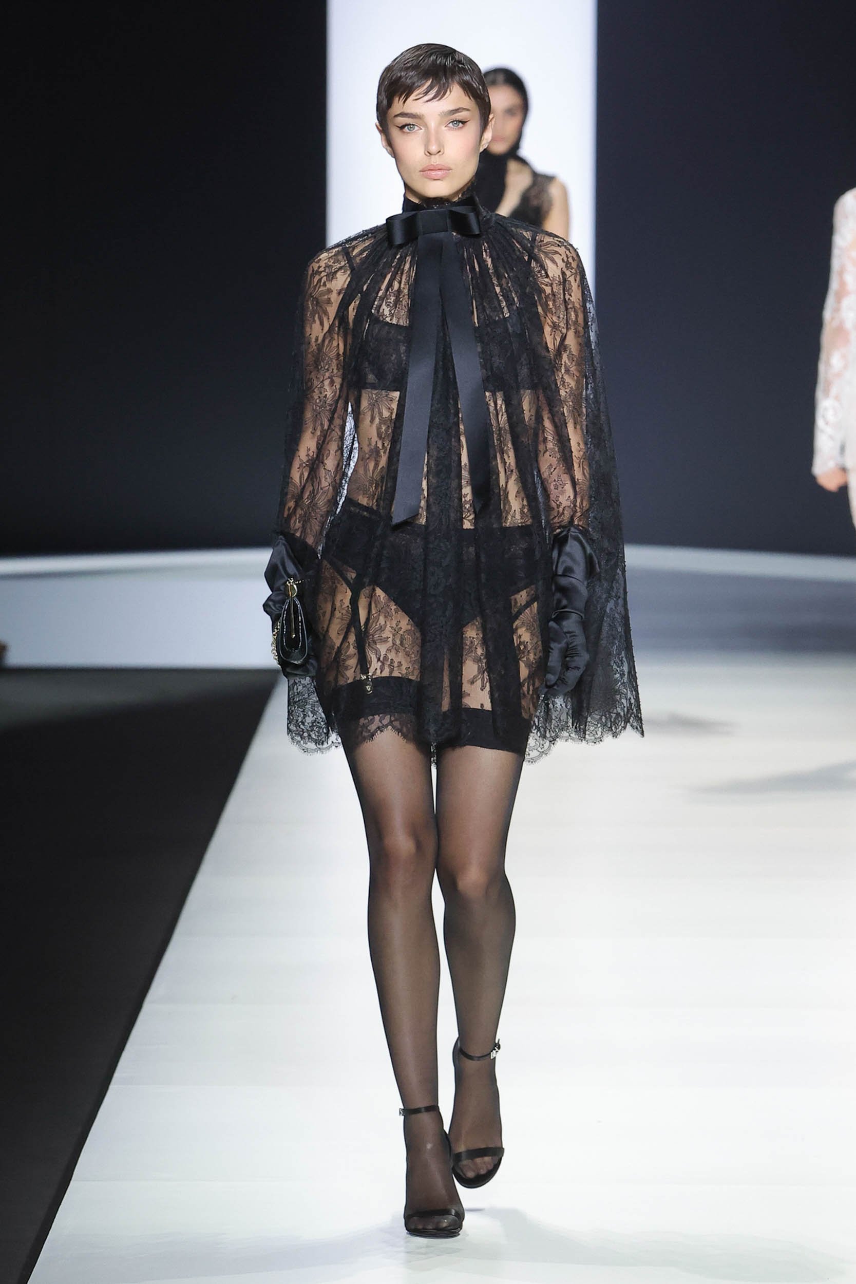 ドメニコ?ドルチェ(Domenico Dolce)とステファノ?ガッバーナ(Stefano Gabbana)が手掛ける「ドルチェ&ガッバーナ」の今季のテーマは「WOMAN」。力強くも挑発的な女性たちを讃えるモノクロ写真をインスピレーション源に、ブラックとホワイトを中心にしたルックを披露した。1960年代のクリーンなラインとシルエットも取り入れ、ブランドのコードを再解釈。コルセットやアンダーウェアにシアーなブラウスやチュールドレスを重ね、官能的なムードを演出。新たなシチリアの女性像を創り上げた。