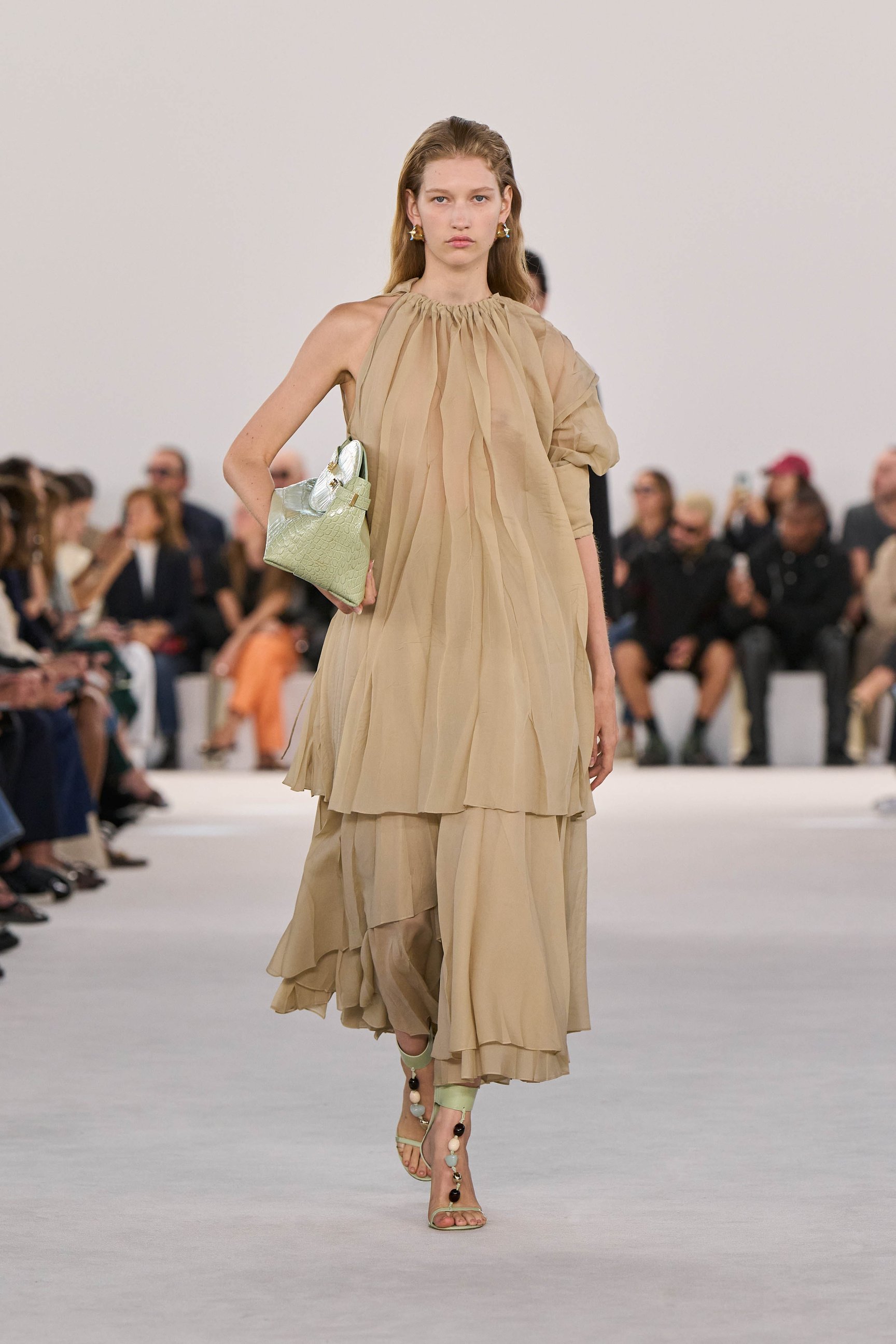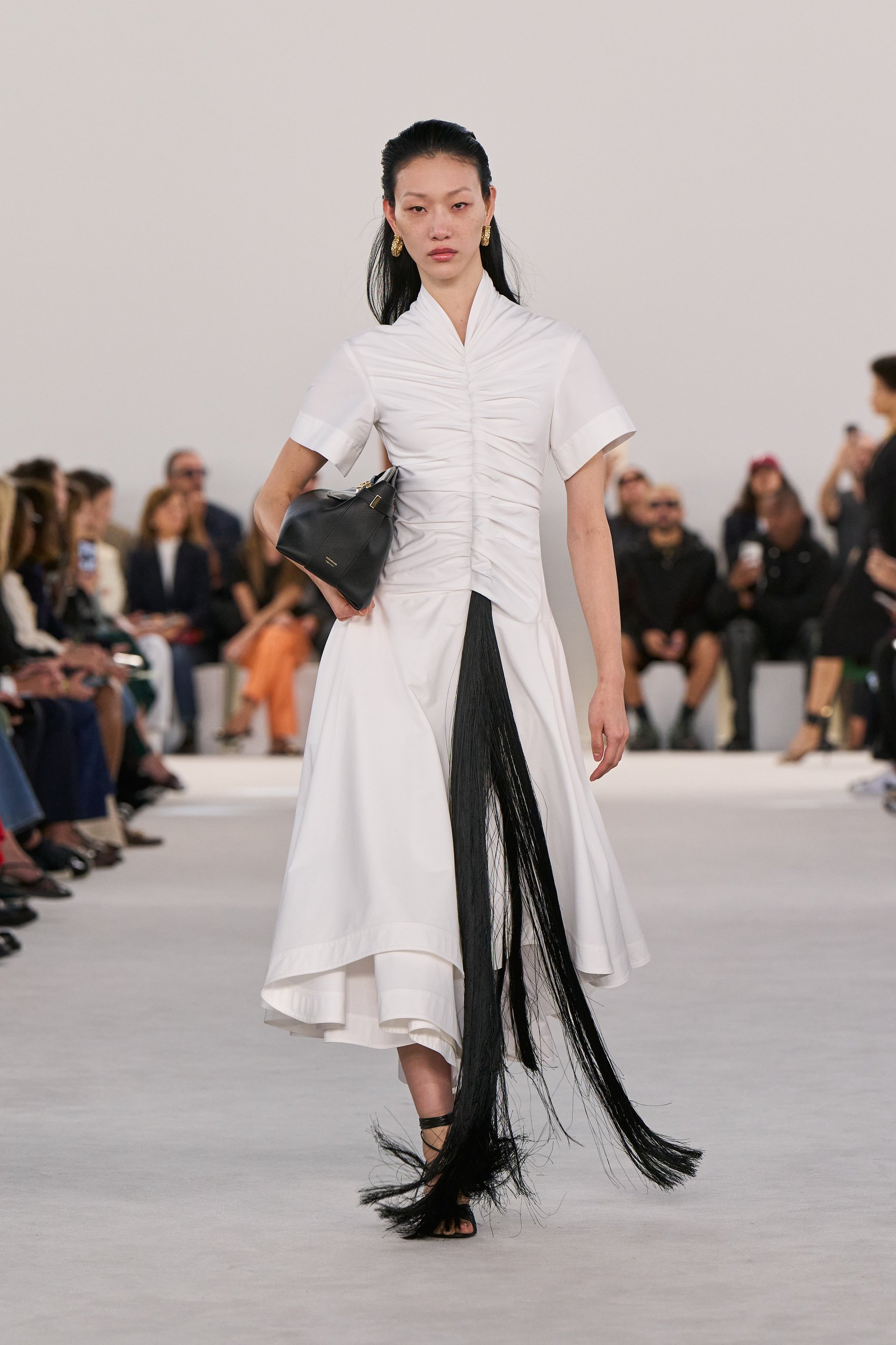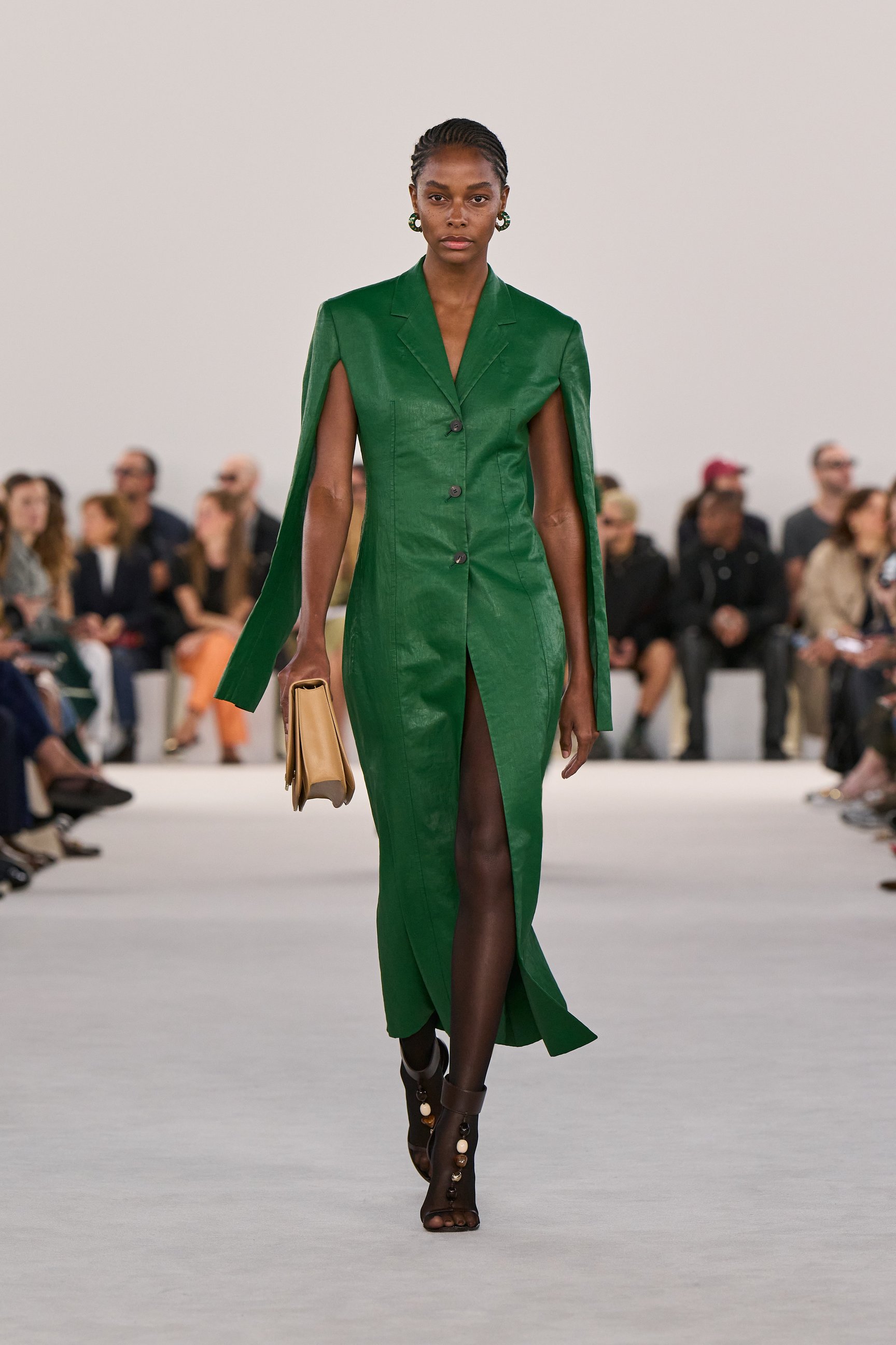 マクシミリアン?デイウ?ィス(Maximilian Davis)が手掛ける「フェラガモ」は、イタリアとカリブ海のドレスコードの精神に類似点を見出しながら、1960~70年代にイタリアで興った「アルテ?ポーウ?ェラ(Arte Povera)」のコントラストからもインスピレーションを得たという。アルテ?ポーウ?ェラは、日常にある天然素材と人工物を組み合わせ、アートへと昇華させた芸術運動。それに倣い、デイリーな素材であるリネンやコットンをサテンにボンディングしてケープにするなど、天然素材を洗練されたスタイルに昇華させた。「親しみやすいワードローブであると同時に、手で触れた感覚がおもしろいものを作りたかった」とマクシミリアンは語る。
