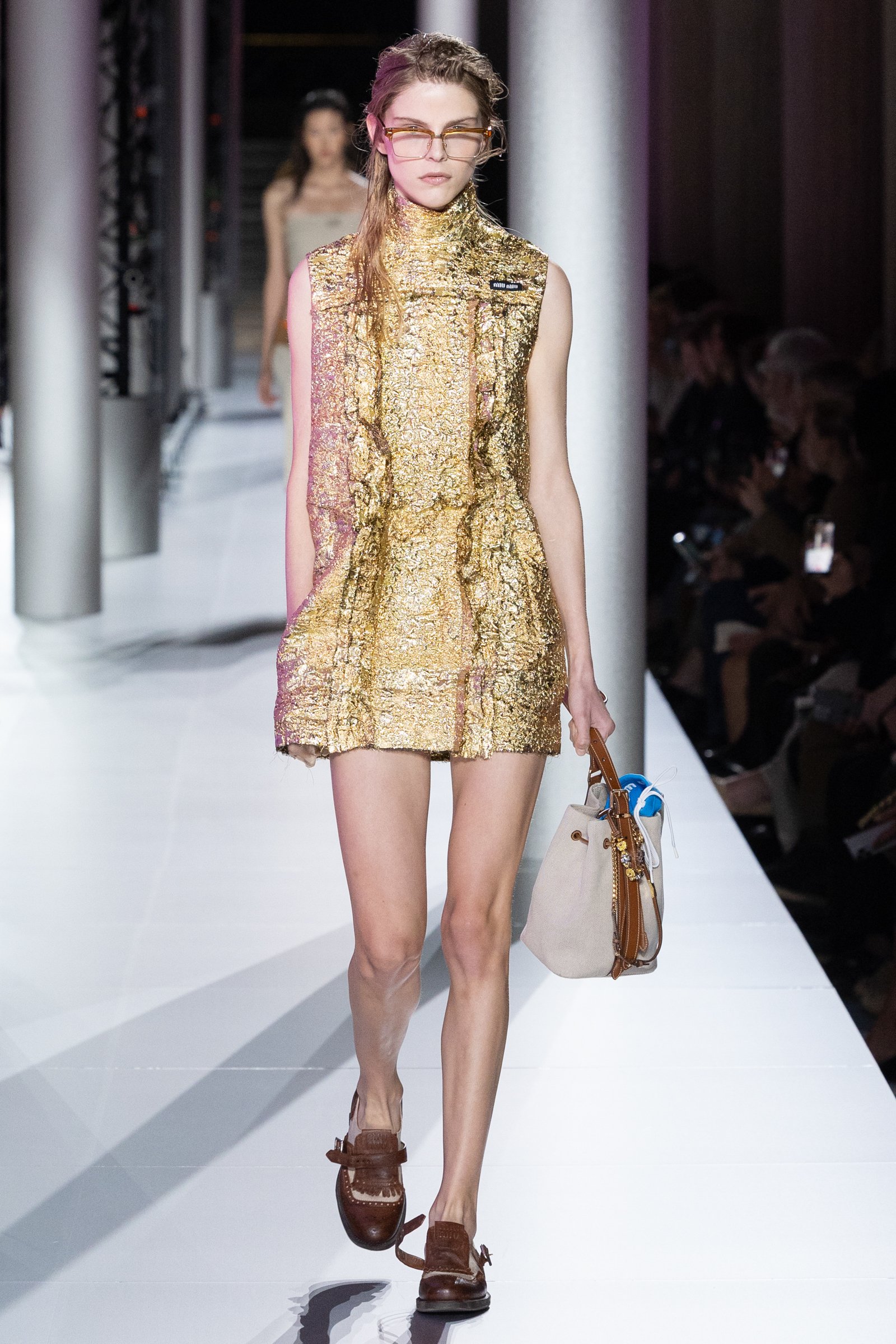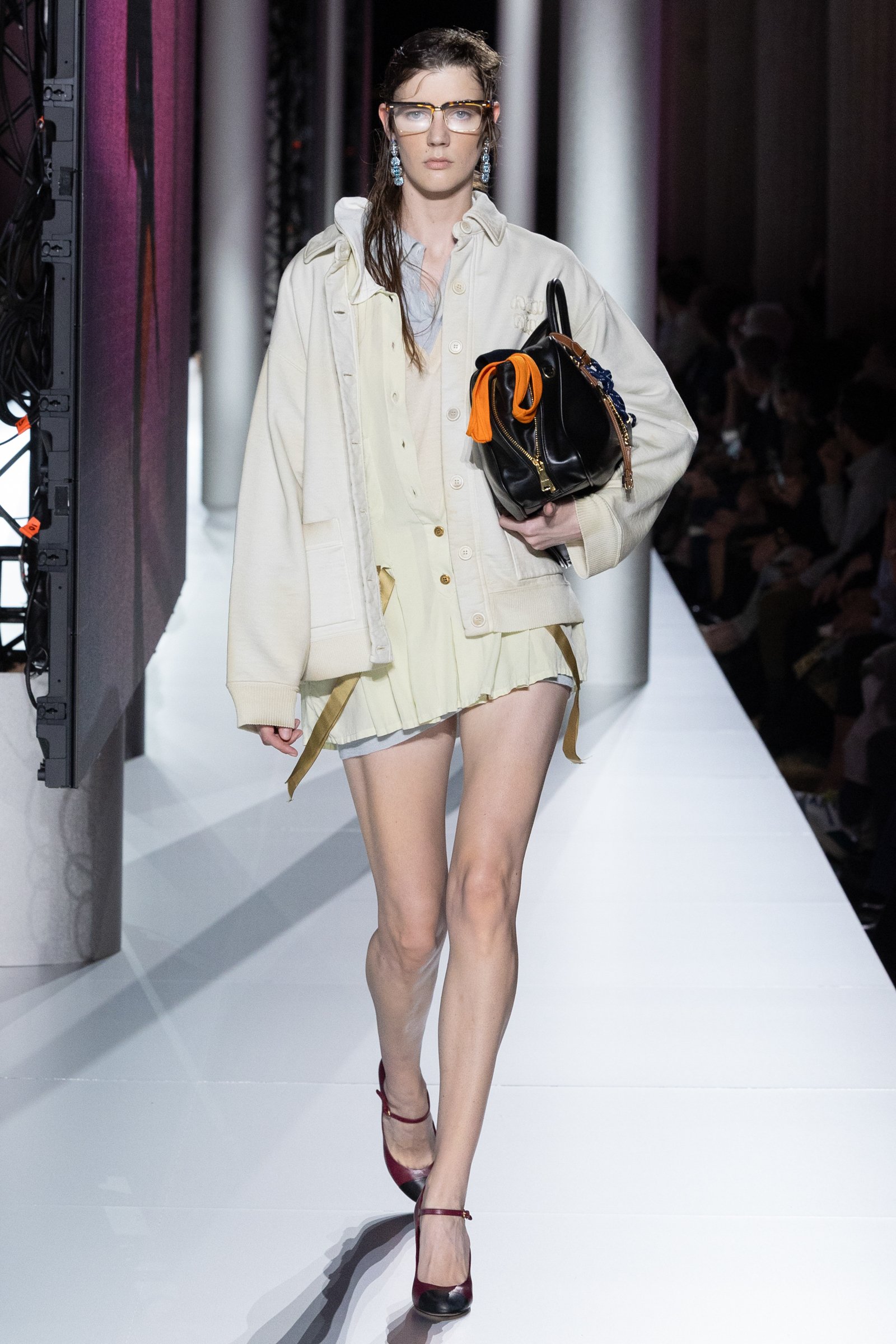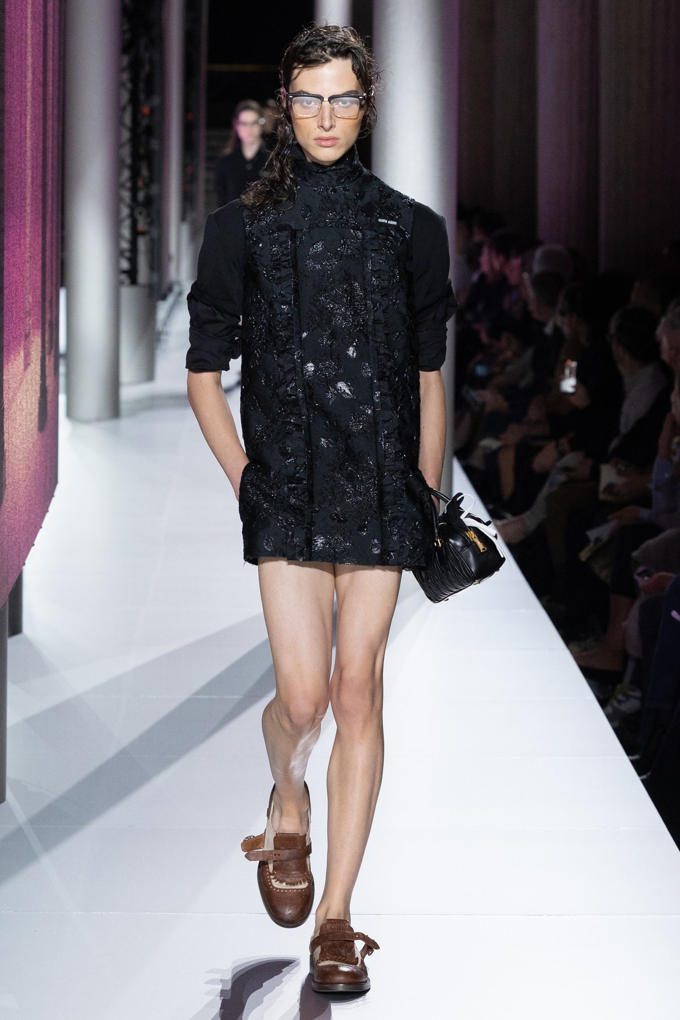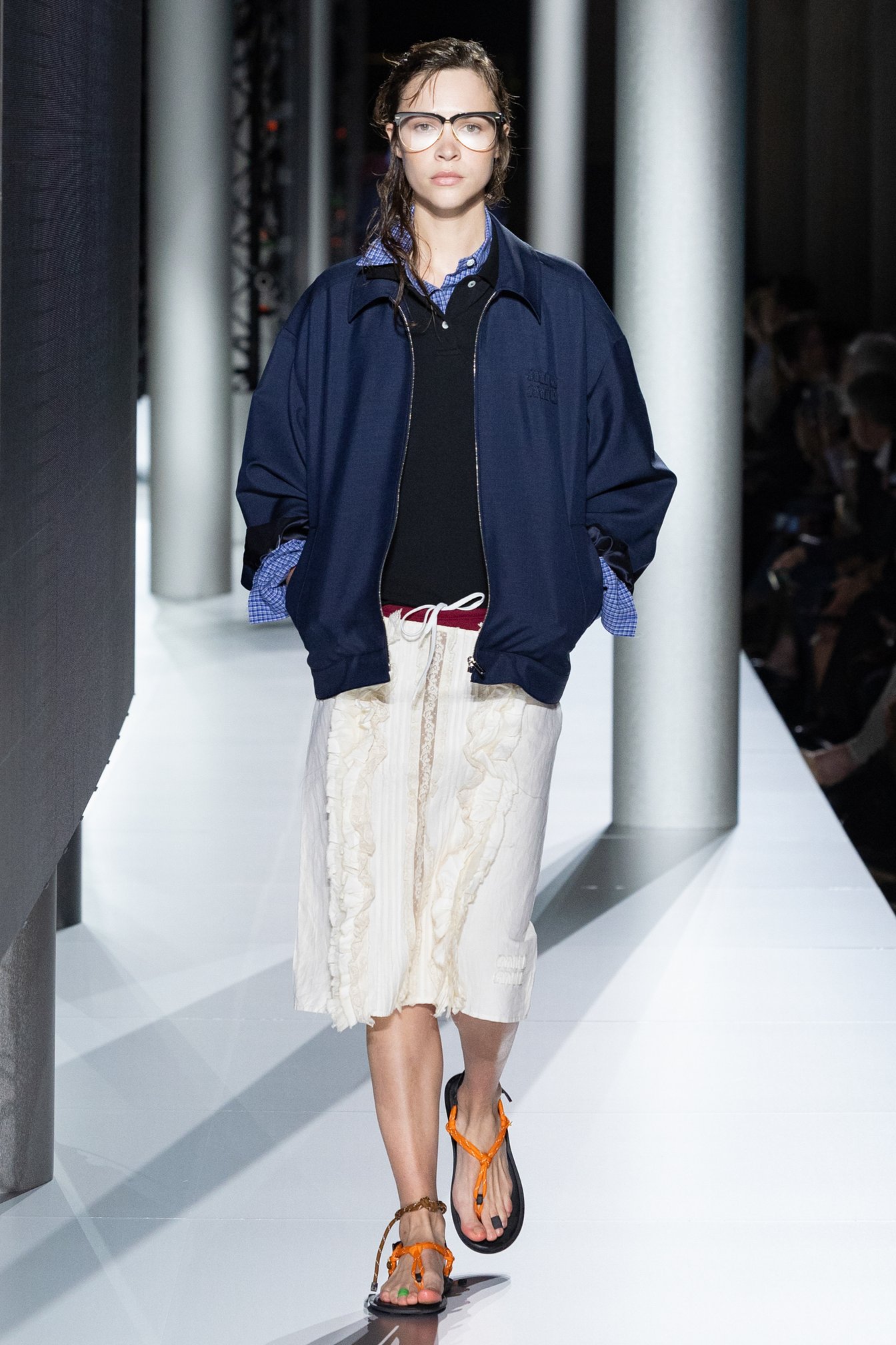 ミュウミュウのショーや広告キャンペーンを手掛けるスタイリスト、ロッタ?ヴォルコヴァ(Lotta Volkova)のセンスも光る。多くのルックでシャツの片襟をトップスの上に出し、もう片襟を潜らせるなど、ロッタが得意とするルーズでナードなエッセンスを加えていた。