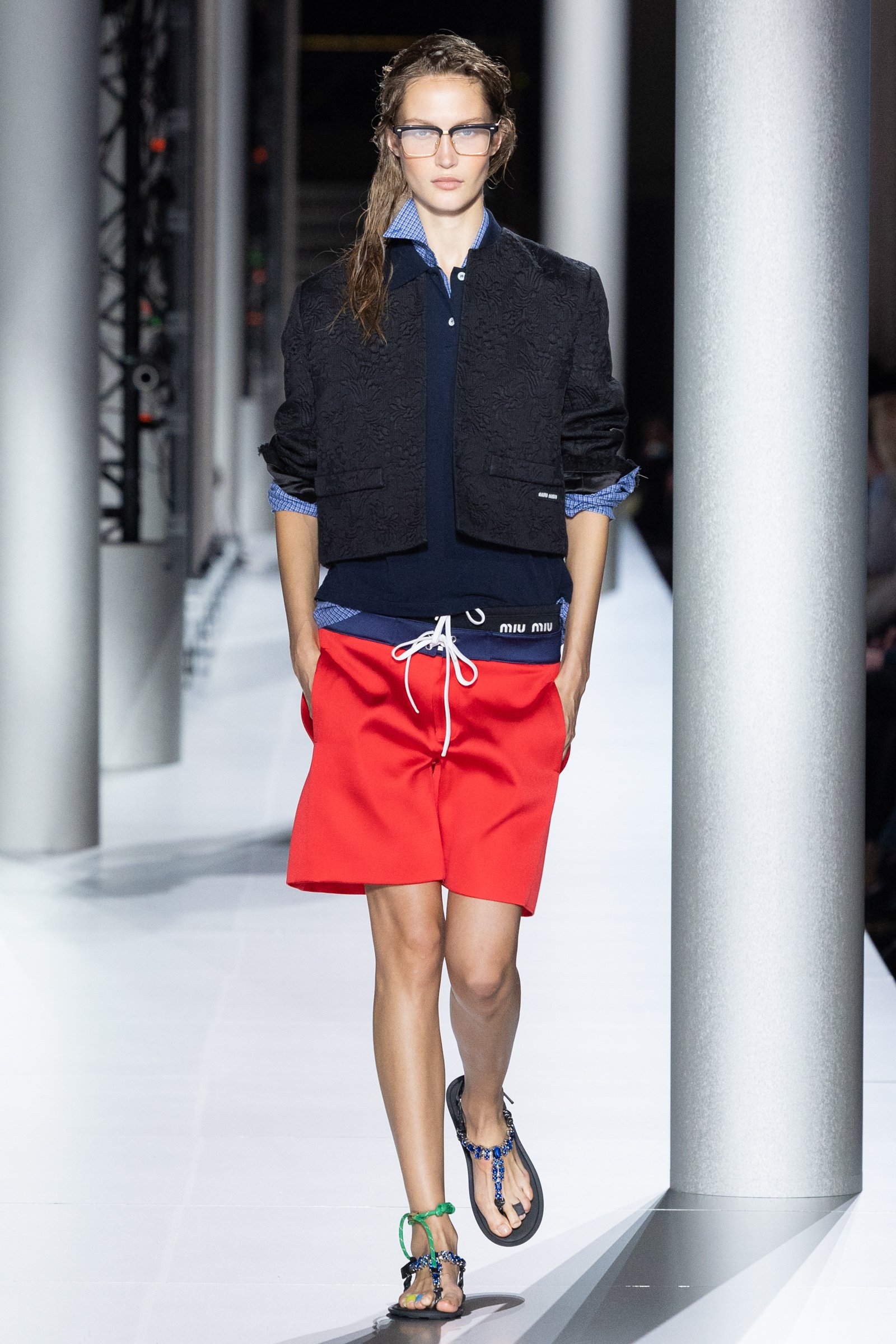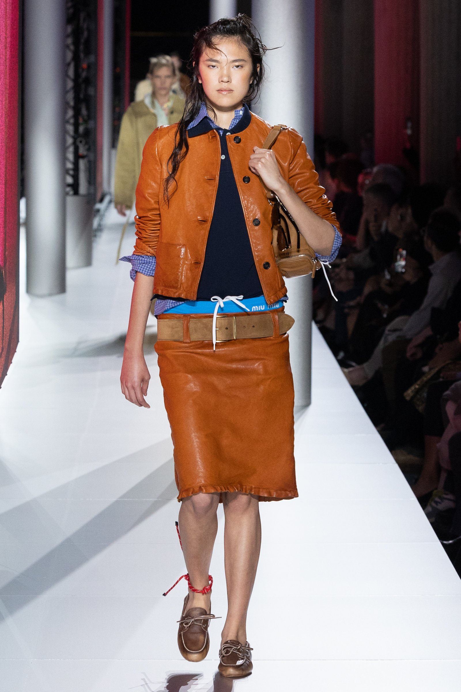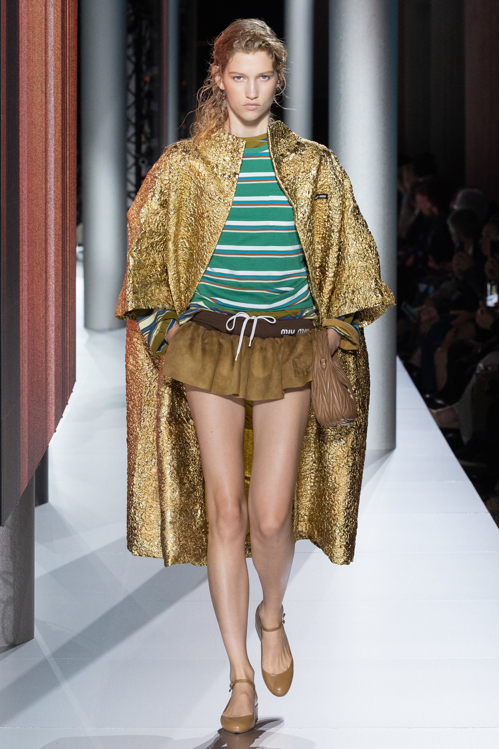 ミュウミュウのショーや広告キャンペーンを手掛けるスタイリスト、ロッタ?ヴォルコヴァ(Lotta Volkova)のセンスも光る。多くのルックでシャツの片襟をトップスの上に出し、もう片襟を潜らせるなど、ロッタが得意とするルーズでナードなエッセンスを加えていた。
