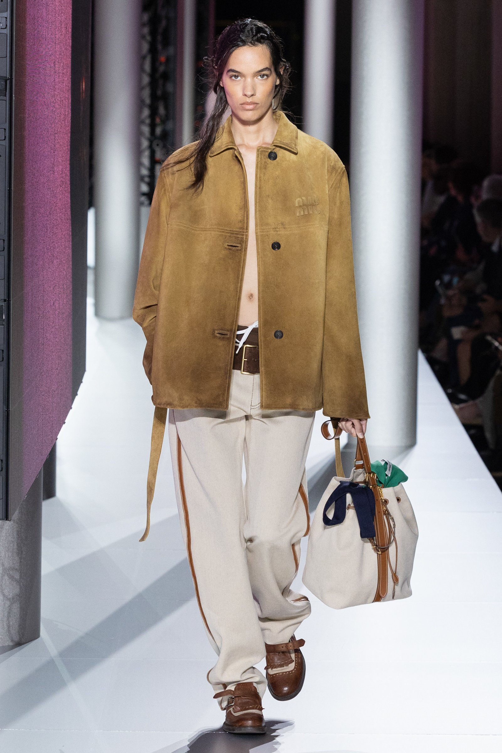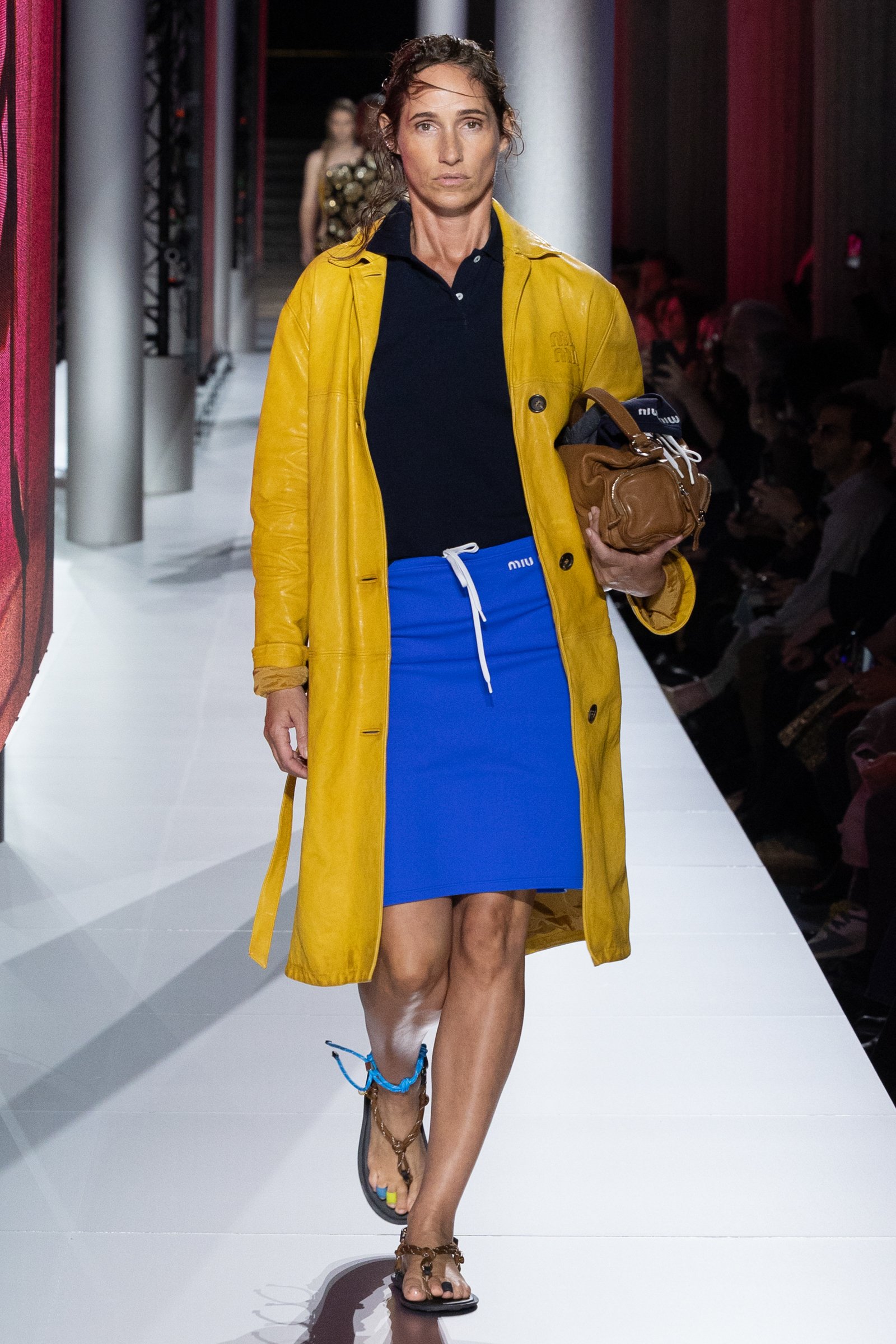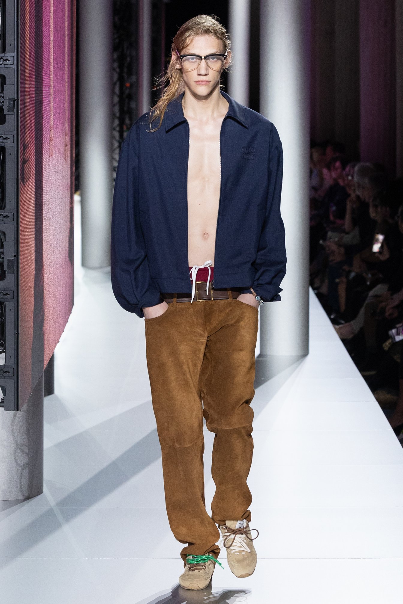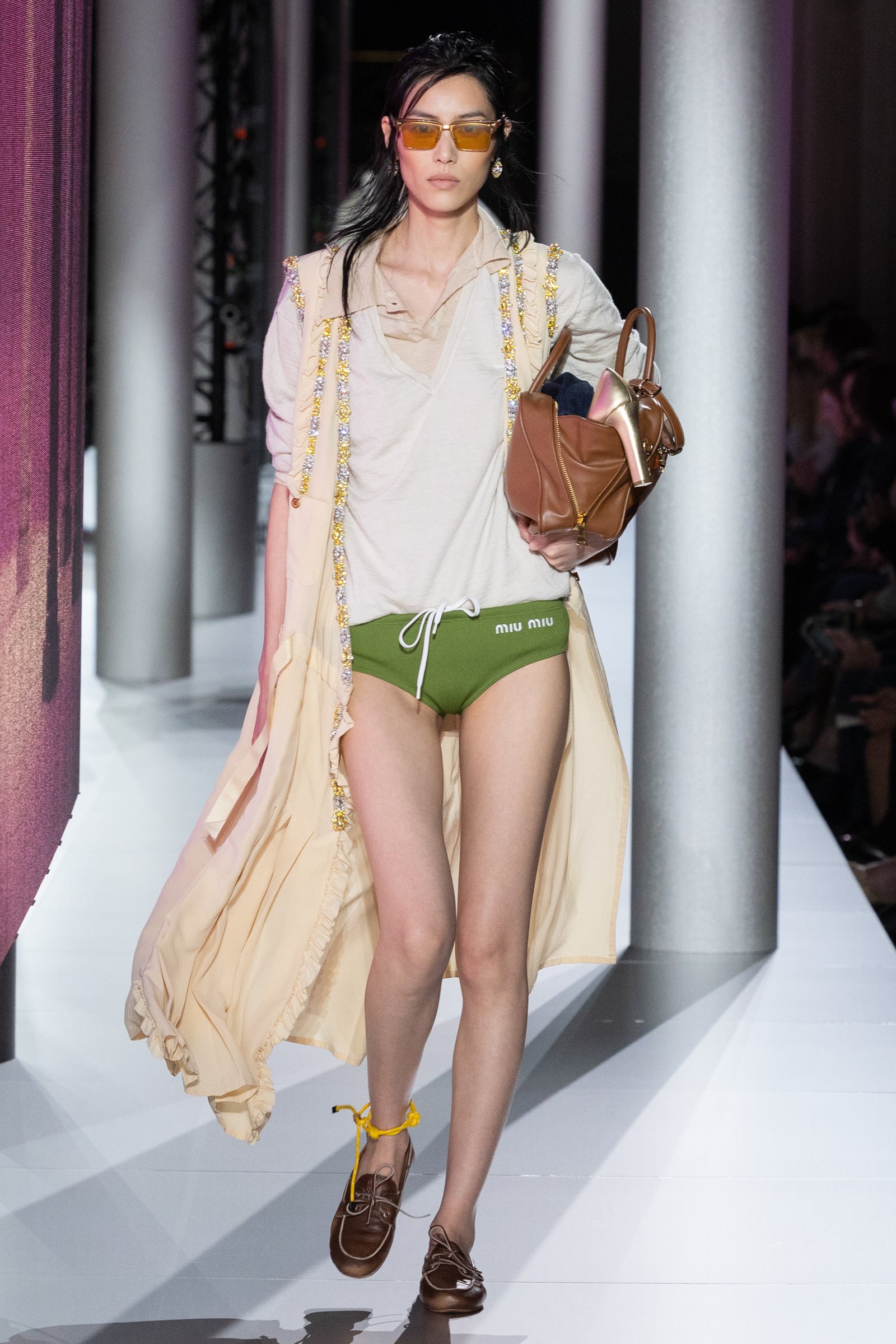 ミュウミュウのショーや広告キャンペーンを手掛けるスタイリスト、ロッタ?ヴォルコヴァ(Lotta Volkova)のセンスも光る。多くのルックでシャツの片襟をトップスの上に出し、もう片襟を潜らせるなど、ロッタが得意とするルーズでナードなエッセンスを加えていた。