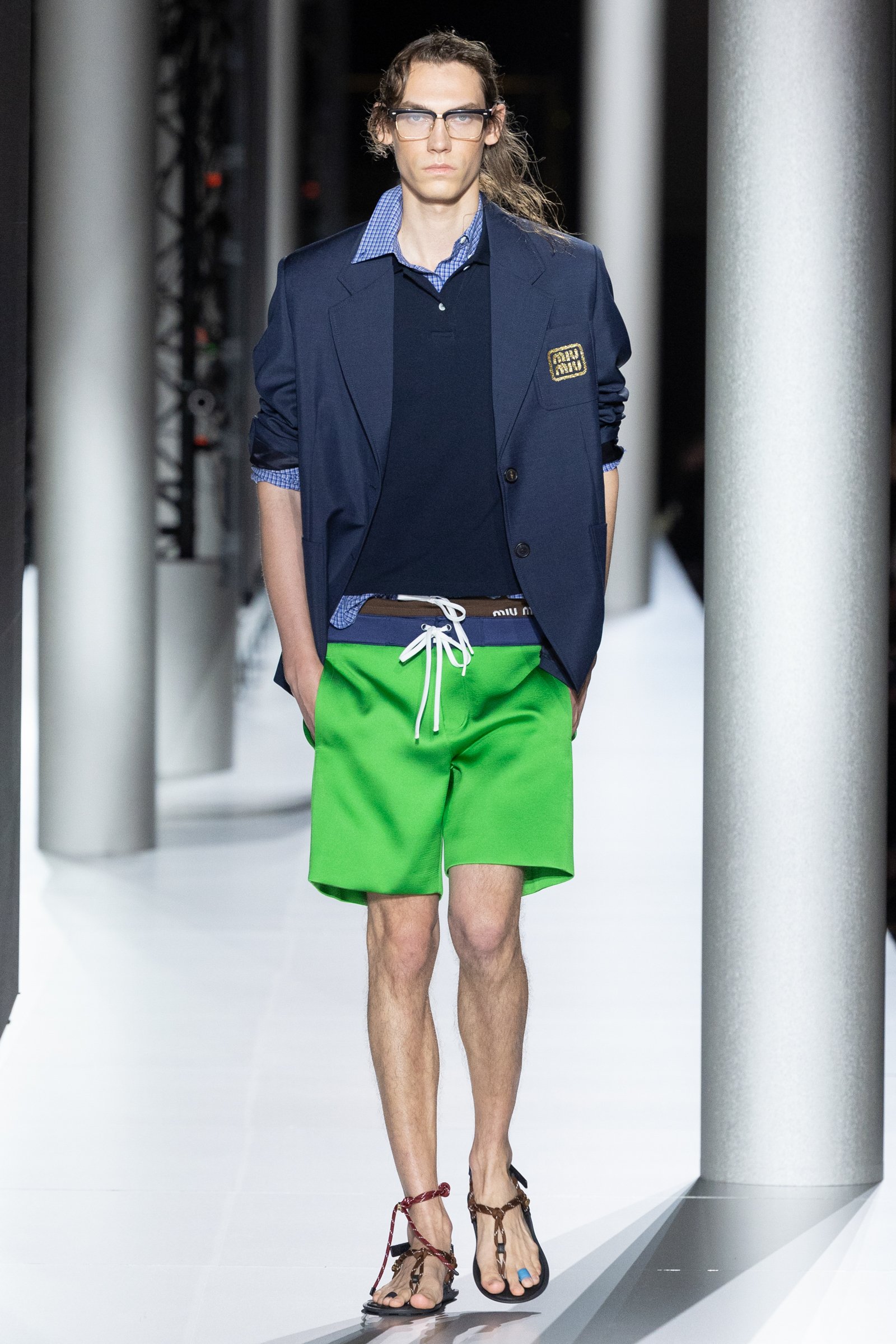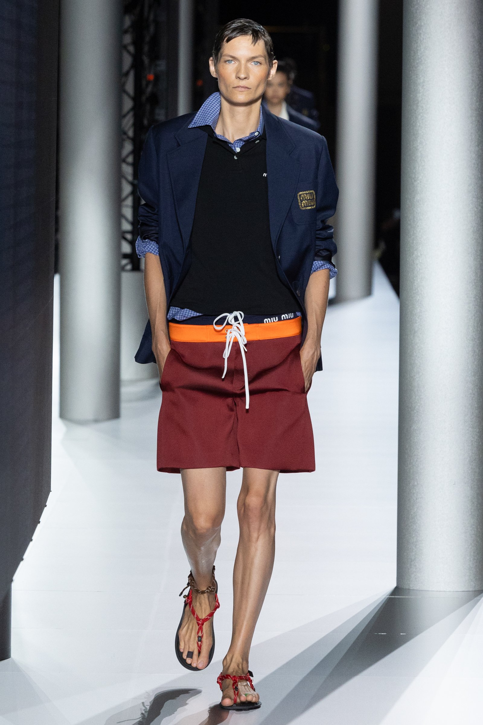 “見せパン”をはじめ、数シーズンにわたりインナーウェアをキーアイテムとしてきたが、今シーズンはスイムウェアを大々的にフォーカス。ファーストルックでは、いわゆるメンズ用の“海パン”を2枚レイヤードしてネイビーのブレザーと提案していたのだが、この“ブレザー×スイムウェア”のスタイリングが前半のハイライトに。ブリーフタイプからフリルの付いたものまで、ストレートな肌見せがヴィヴィッドなカラーとあいまって、よりヘルシーな印象を与える。