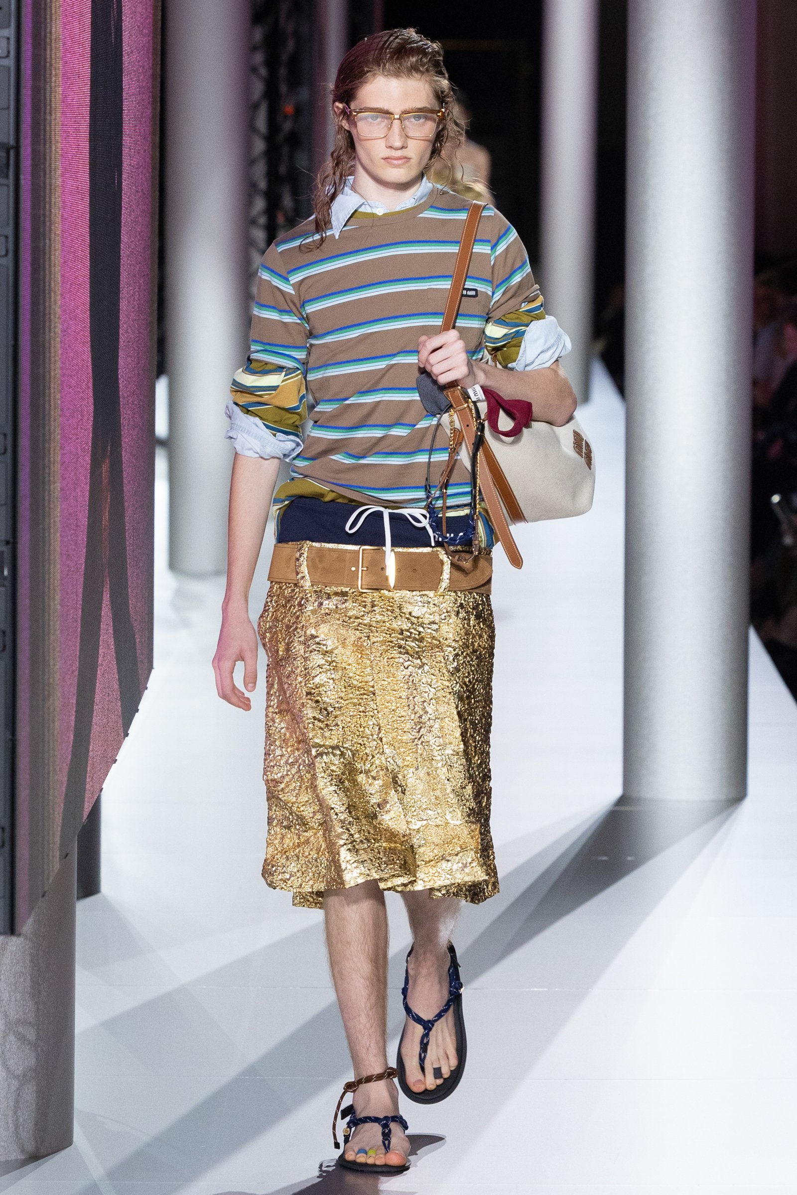 フィナーレではミウッチャと共に、彼女の右腕として長年にわたり「ミュウミュウ」と「プラダ(PRADA)」でデザイン?ディレクターを務め、今月末で退職することが決まっているファビオ?ザンベルナルディ(Fabio Zambernardi)が登場。惜しみない拍手が送られた彼もまた、片襟がTシャツの下に潜っていた。