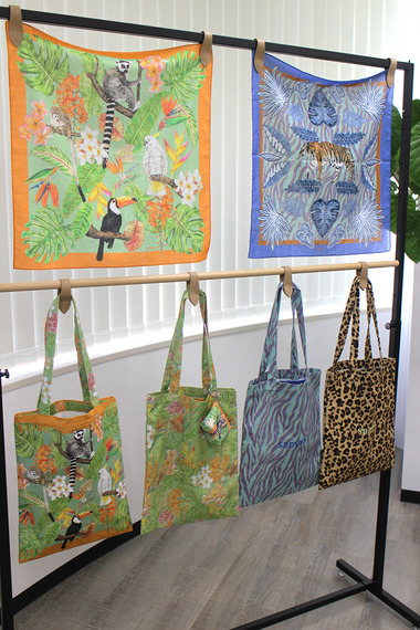 リアルなタッチのカラフルでインパクトのある原画を水彩画で描き、バッグのプリント柄として配置や大きさなど各アイテムでのバランスを考えて落とし込む。有力専門店との協業による販売が実現した。トートバッグで税抜き9000円、ポーチで3500円、バンダナ2500円。