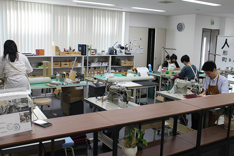 工房のスタッフには個人でブランドを手掛けつつ、生産に従事する者もいる。10月と12月に工房で開催したワークショップでは、地元住民らを中心に参加希望者を募り、「人形焼」をイメージした本革がま口ポーチを作った。同ポーチは人形町BASEの職人でもある、食品をモチーフにした革製品を作る山ナ鞄がプロデュースする。三谷博己社長は「地域密着のイベントなどを開催し認知度を高め、将来的にカフェ併設のショップにつなげたい」と考えている。